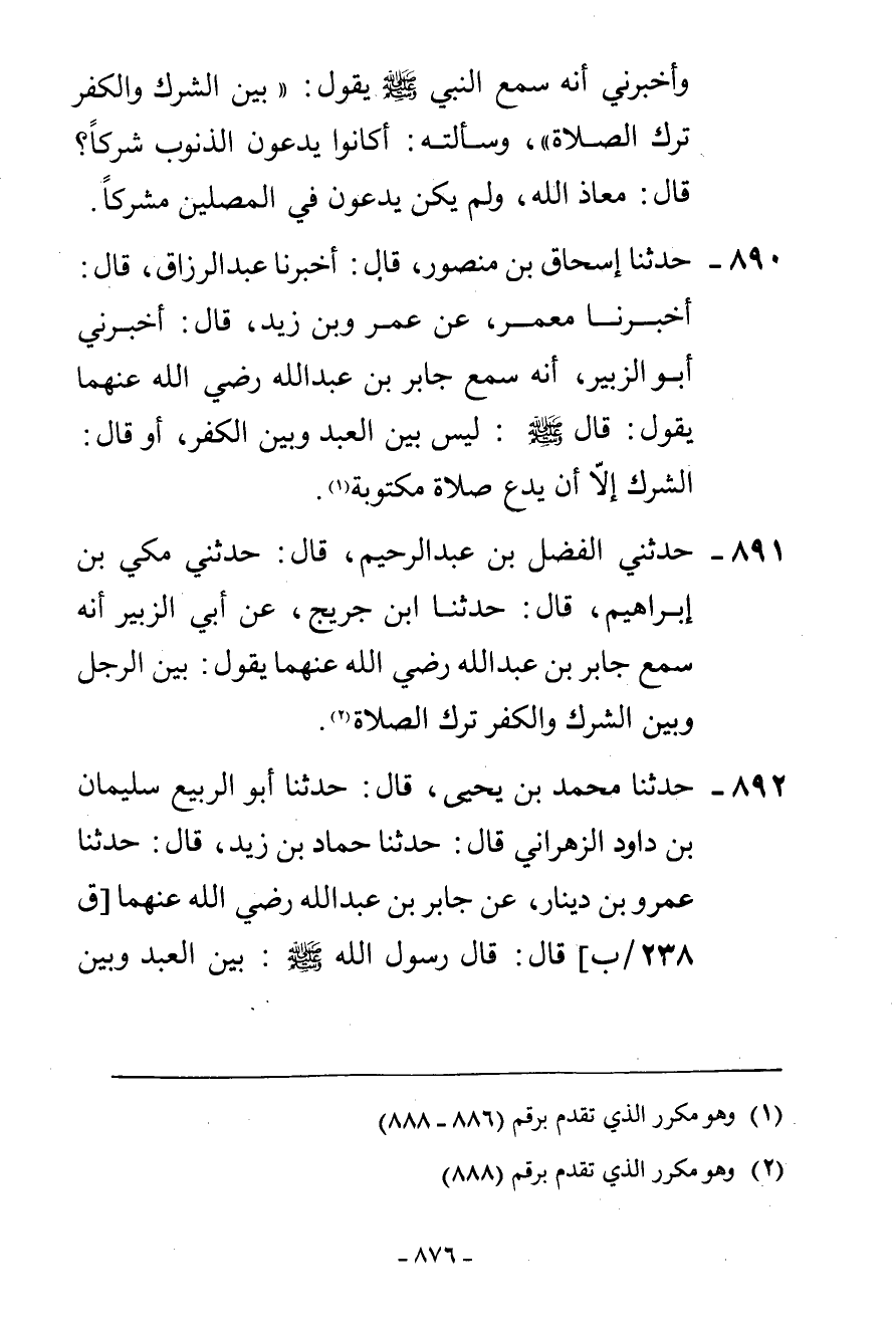 891 - حَدَّثَنِي الْفَضْلُ بْنُ عَبْدِ الرَّحِيمِ، قَالَ: حَدَّثَنِي مَكِّيُّ بْنُ إِبْرَاهِيمَ، قَالَ: حَدَّثَنَا ابْنُ جُرَيْجٍ، عَنْ أَبِي الزُّبَيْرِ، أَنَّهُ سَمِعَ جَابِرَ بْنَ عَبْدِ اللهٍ رَضِيَ اللَّهُ عَنْهُمَا يَقُولُ: «§بَيْنَ الرَّجُلِ وَبَيْنَ الشِّرْكِ وَالْكُفْرِ تَرْكُ الصَّلَاةِ»