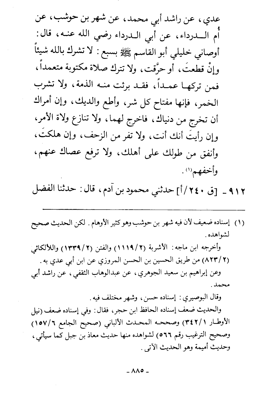 912 - حَدَّثَنِي مَحْمُودُ بْنُ آدَمَ، قَالَ: حَدَّثَنَا الْفَضْلُ -[886]- بْنُ مُوسَى، قَالَ: حَدَّثَنَا أَبُو فَرْوَةَ الرَّهَاوِيُّ، عَنْ أَبِي يَحْيَى الْكَلَاعِيِّ، عَنْ جُبَيْرِ بْنِ نُفَيْرٍ، عَنْ أُمَيْمَةَ، مَوْلَاةِ النَّبِيِّ صَلَّى اللهُ عَلَيْهِ وَسَلَّمَ قَالَتْ: كُنْتُ أُوَضِّئُهُ يَوْمًا أُفْرِغُ عَلَى يَدَيْهِ الْمَاءَ إِذْ جَاءَهُ أَعْرَابِيٌّ فَقَالَ: §أَوْصِنِي يَا رَسُولَ اللَّهِ فَإِنِّي أُرِيدُ اللُّحُوقَ بِأَهْلِي، قَالَ: «لَا تُشْرِكَنَّ بِاللَّهِ شَيْئًا وَإِنْ قُطِّعْتَ وَحُرِّقْتَ بِالنَّارِ، وَأَطِعْ وَالِدَيْكَ فِيمَا أَمَرَاكَ وَإِنْ أَمَرَاكَ أَنْ تُخَلِّيَ مِنْ دُنْيَاكَ وَأَهْلِكَ فَتَخَلَّى مِنْهَا، وَلَا تَدَعَنَّ صَلَاةً مُتَعَمِّدًا فَإِنَّهُ مَنْ تَرَكَهَا فَقَدْ بَرِئَتْ مِنْهُ ذِمَّةُ اللَّهِ تَعَالَى وَذِمَّةُ رَسُولِهِ صَلَّى اللهُ عَلَيْهِ وَسَلَّمَ»