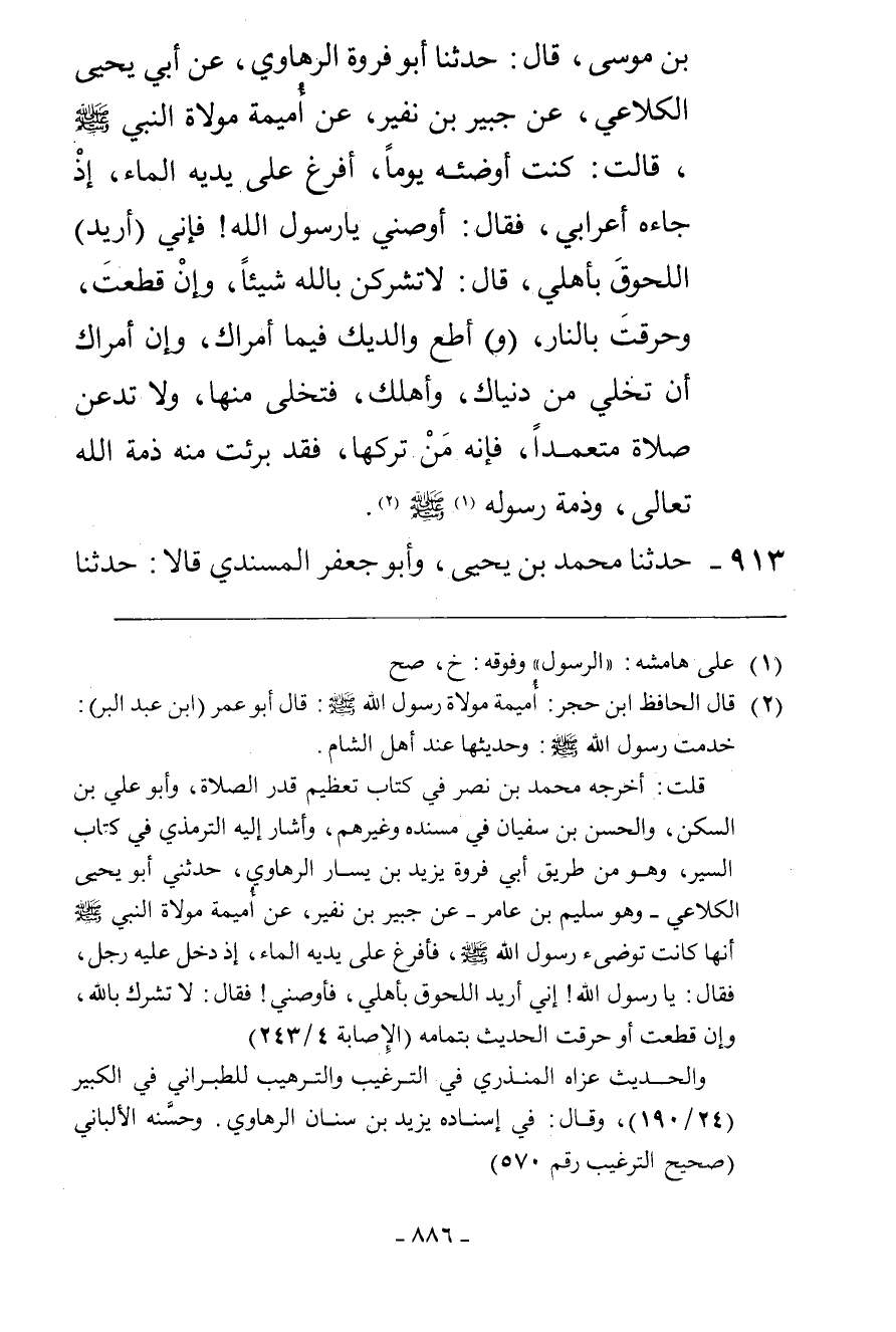 913 - حَدَّثَنَا مُحَمَّدُ بْنُ يَحْيَى، وَأَبُو جَعْفَرٍ الْمُسْنَدِيُّ قَالَا: حَدَّثَنَا -[887]- أَبُو مُسْهِرٍ، قَالَ: حَدَّثَنَا سَعِيدُ بْنُ عَبْدِ الْعَزِيزِ، عَنْ مَكْحُولٍ، عَنْ أُمِّ أَيْمَنَ رَضِيَ اللَّهُ عَنْهَا قَالَتْ: §أَوْصَى رَسُولُ اللَّهِ صَلَّى اللهُ عَلَيْهِ وَسَلَّمَ بَعْضَ أَهْلِهِ: «لَا تَتْرُكِ الصَّلَاةَ عَمْدًا فَإِنَّهُ مَنْ يَتْرُكِ الصَّلَاةَ عَمْدًا فَقَدْ بَرِئَتْ مِنْهُ ذِمَّةُ اللَّهِ تَعَالَى»