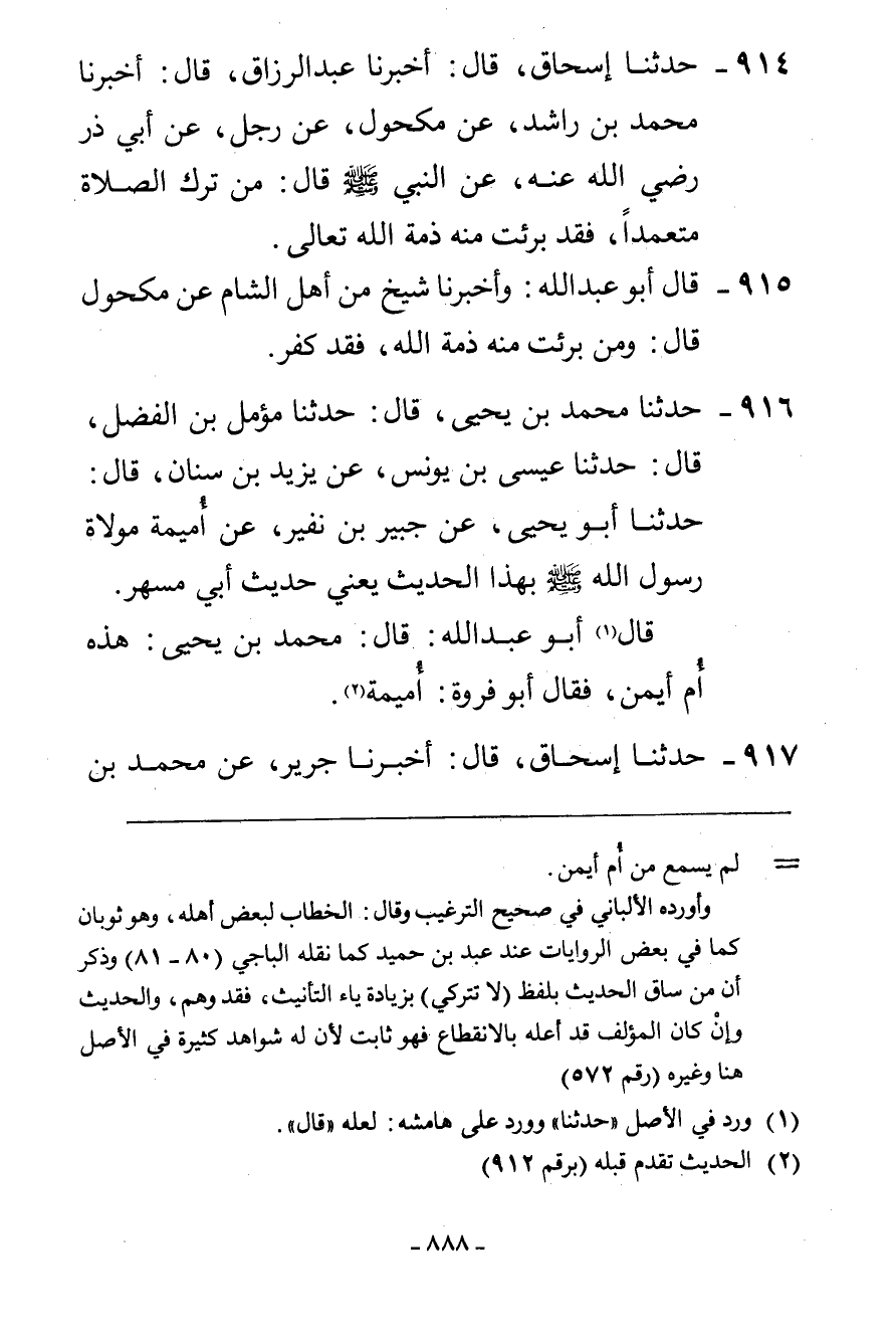 914 - حَدَّثَنَا إِسْحَاقُ، قَالَ: أَخْبَرَنَا عَبْدُ الرَّزَّاقِ، قَالَ: أَخْبَرَنَا مُحَمَّدُ بْنُ رَاشِدٍ، عَنْ مَكْحُولٍ، عَنْ رَجُلٍ، عَنْ أَبِي ذَرٍّ رَضِيَ اللَّهُ عَنْهُ عَنِ النَّبِيِّ صَلَّى اللهُ عَلَيْهِ وَسَلَّمَ قَالَ: «§مَنْ تَرَكَ الصَّلَاةَ مُتَعَمِّدًا فَقَدْ بَرِئَتْ مِنْهُ ذِمَّةُ اللَّهِ تَعَالَى»