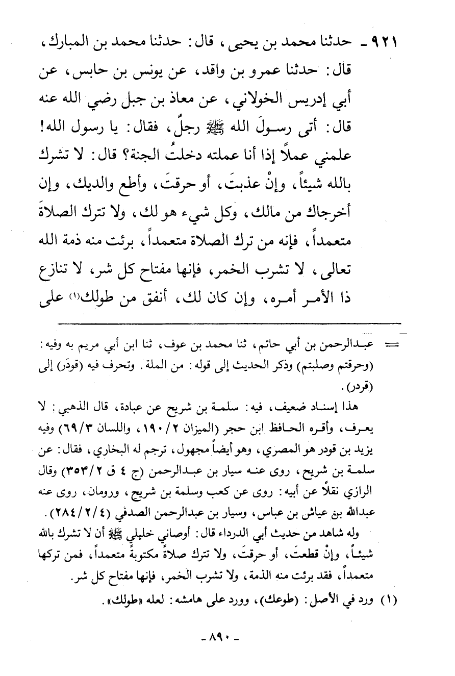 921 - حَدَّثَنَا مُحَمَّدُ بْنُ يَحْيَى، قَالَ: حَدَّثَنَا مُحَمَّدُ بْنُ الْمُبَارَكِ، قَالَ: حَدَّثَنَا عَمْرُو بْنُ وَاقِدٍ، عَنْ يُونُسَ بْنِ حَلْبَسٍ، عَنْ أَبِي إِدْرِيسَ الْخَوْلَانِيِّ، عَنْ مُعَاذِ بْنِ جَبَلٍ رَضِيَ اللَّهُ عَنْهُ قَالَ: §أَتَى رَسُولَ اللَّهِ صَلَّى اللهُ عَلَيْهِ وَسَلَّمَ رَجُلٌ فَقَالَ: يَا رَسُولَ اللَّهِ عَلِّمْنِي عَمَلًا إِذَا أَنَا عَمِلْتُهُ دَخَلْتُ الْجَنَّةَ قَالَ: «لَا تُشْرِكْ بِاللَّهِ شَيْئًا وَإِنْ عُذِّبْتَ أَوْ حُرِّقْتَ وَأَطِعْ وَالِدَيْكَ وَإِنْ أَخْرَجَاكَ مِنْ مَالِكَ وَكُلِّ شَيْءٍ هُوَ لَكَ، وَلَا تَتْرُكِ الصَّلَاةَ مُتَعَمِّدًا فَإِنَّهُ مَنْ تَرَكَ الصَّلَاةَ مُتَعَمِّدًا بَرِئَتْ مِنْهُ ذِمَّةُ اللَّهِ تَعَالَى، لَا تَشْرَبِ الْخَمْرَ فَإِنَّهَا مِفْتَاحُ كُلِّ شَرٍّ، لَا تُنَازِعْ ذَا الْأَمْرِ أَمْرَهُ وَإِنْ كَانَ لَكَ، أَنْفِقْ مِنْ طَوْلِكَ عَلَى -[891]- أَهْلِكَ لَا تَرْفَعْ عَنْهُمْ عَصَاكَ أَخِفْهُمْ فِي اللَّهِ تَعَالَى، لَا تَغْلُلْ، وَلَا تَفِرَّ يَوْمَ الزَّحْفِ» ثُمَّ قَالَ لَهُ: «قُمْ»