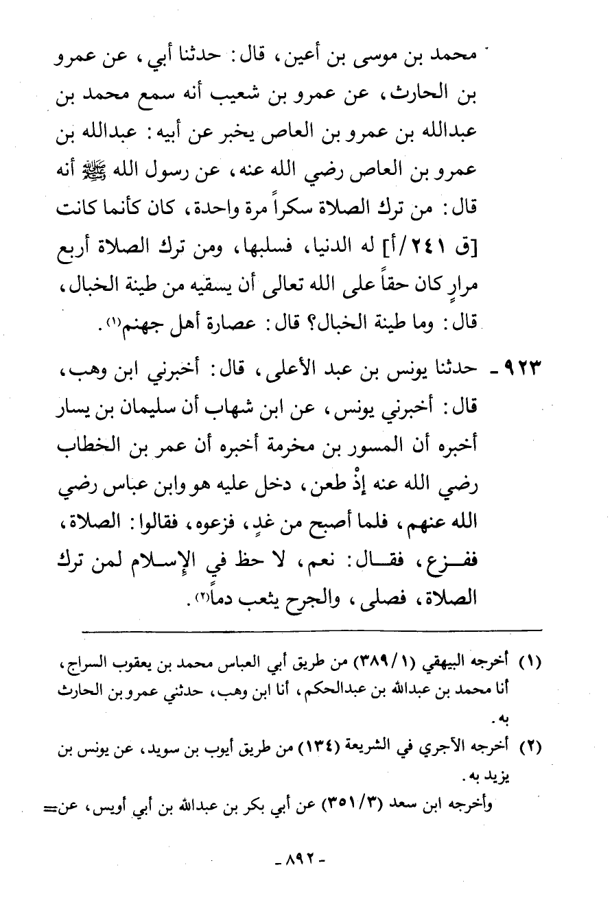 923 - حَدَّثَنَا يُونُسُ بْنُ عَبْدِ الْأَعْلَى، قَالَ: أَخْبَرَنِي ابْنُ وَهْبٍ، قَالَ: أَخْبَرَنِي يُونُسُ، عَنِ ابْنِ شِهَابٍ، أَنَّ سُلَيْمَانَ بْنَ يَسَارٍ أَخْبَرَهُ أَنَّ الْمِسْوَرَ بْنَ مَخْرَمَةَ أَخْبَرَهُ أَنَّ عُمَرَ بْنَ الْخَطَّابِ رَضِيَ اللَّهُ عَنْهُ إِذْ طُعِنَ دَخَلَ عَلَيْهِ هُوَ وَابْنُ عَبَّاسٍ رَضِيَ اللَّهُ عَنْهُمْ فَلَمَّا أَصْبَحَ مِنْ غَدٍ فَزَّعُوهُ فَقَالُوا: الصَّلَاةَ فَفَزِعَ فَقَالَ: «نَعَمْ §لَا حَظَّ فِي الْإِسْلَامِ لِمَنْ تَرَكَ الصَّلَاةَ فَصَلَّى وَالْجُرْحُ يَثْعَبُ دَمًا»