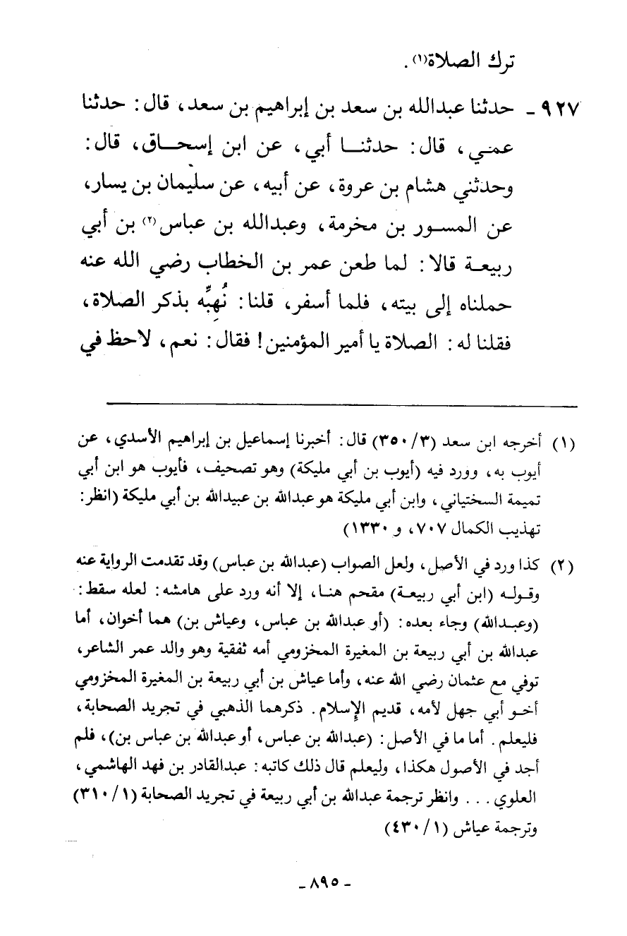 927 - حَدَّثَنَا عَبْدُ اللَّهِ بْنُ سَعْدِ بْنِ إِبْرَاهِيمَ بْنِ سَعْدٍ، قَالَ: حَدَّثَنَا عَمِّي، قَالَ: حَدَّثَنَا أَبِي، عَنِ ابْنِ إِسْحَاقَ، قَالَ: وَحَدَّثَنِي هِشَامُ بْنُ عُرْوَةَ، عَنْ أَبِيهِ، عَنْ سُلَيْمَانَ بْنِ يَسَارٍ، عَنِ الْمِسْوَرِ بْنِ مَخْرَمَةَ، وَعَبْدِ اللَّهِ بْنِ عَبَّاسِ بْنِ أَبِي رَبِيعَةَ، قَالَا: §لَمَّا طُعِنَ عُمَرُ بْنُ الْخَطَّابِ رَضِيَ اللَّهُ عَنْهُ حَمَلْنَاهُ إِلَى بَيْتِهِ فَلَمَّا أَسْفَرَ قُلْنَا: نُهِبُّهُ بِذِكْرِ الصَّلَاةِ فَقُلْنَا لَهُ: الصَّلَاةَ يَا أَمِيرَ الْمُؤْمِنِينَ فَقَالَ: «نَعَمْ لَا حَظَّ فِي الْإِسْلَامِ لِمَنْ تَرَكَ الصَّلَاةَ»