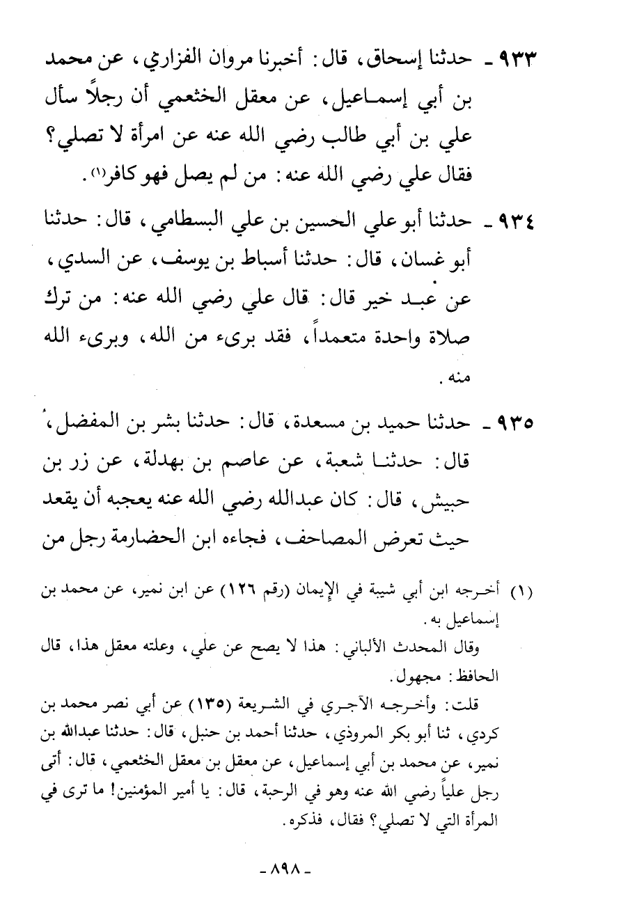 933 - حَدَّثَنَا إِسْحَاقُ، قَالَ: أَخْبَرَنَا مَرْوَانُ الْفَزَارِيُّ، عَنْ مُحَمَّدِ بْنِ أَبِي إِسْمَاعِيلَ، عَنْ مَعْقِلٍ الْخَثْعَمِيِّ، أَنَّ رَجُلًا، سَأَلَ عَلِيَّ بْنَ أَبِي طَالِبٍ رَضِيَ اللَّهُ عَنْهُ عَنِ امْرَأَةٍ، لَا تُصَلِّي فَقَالَ عَلِيٌّ رَضِيَ اللَّهُ عَنْهُ: «§مَنْ لَمْ يُصَلِّ فَهُوَ كَافِرٌ»