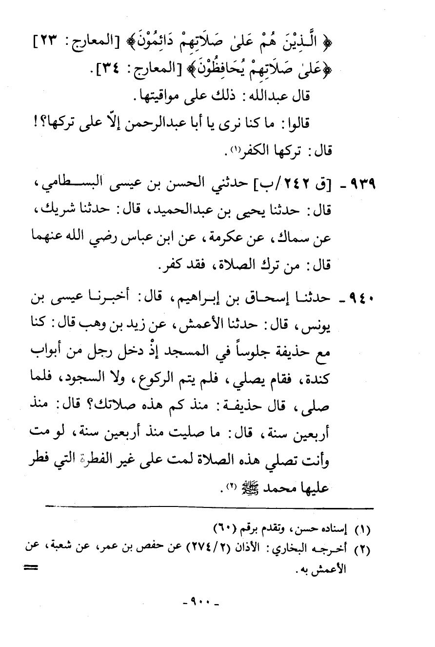940 - حَدَّثَنَا إِسْحَاقُ بْنُ إِبْرَاهِيمَ، قَالَ: أَخْبَرَنَا عِيسَى بْنُ يُونُسَ، قَالَ: حَدَّثَنَا الْأَعْمَشُ، عَنْ زَيْدِ بْنِ وَهْبٍ، قَالَ: كُنَّا مَعَ حُذَيْفَةَ جُلُوسًا فِي الْمَسْجِدِ إِذْ دَخَلَ رَجُلٌ مِنْ أَبْوَابِ كِنْدَةَ، فَقَامَ يُصَلِّي فَلَمْ يُتِمَّ الرُّكُوعَ وَلَا السُّجُودَ فَلَمَّا صَلَّى قَالَ حُذَيْفَةُ: «§مُنْذُ كَمْ هَذِهِ صَلَاتُكَ؟» قَالَ: مُنْذُ أَرْبَعِينَ سَنَةً، قَالَ: «مَا صَلَّيْتَ مُنْذُ أَرْبَعِينَ سَنَةً لَوْ مُتَّ وَأَنْتَ تُصَلِّي هَذِهِ الصَّلَاةَ لَمُتَّ عَلَى غَيْرِ الْفِطْرَةِ الَّتِي فُطِرَ عَلَيْهَا مُحَمَّدٌ صَلَّى اللهُ عَلَيْهِ وَسَلَّمَ»