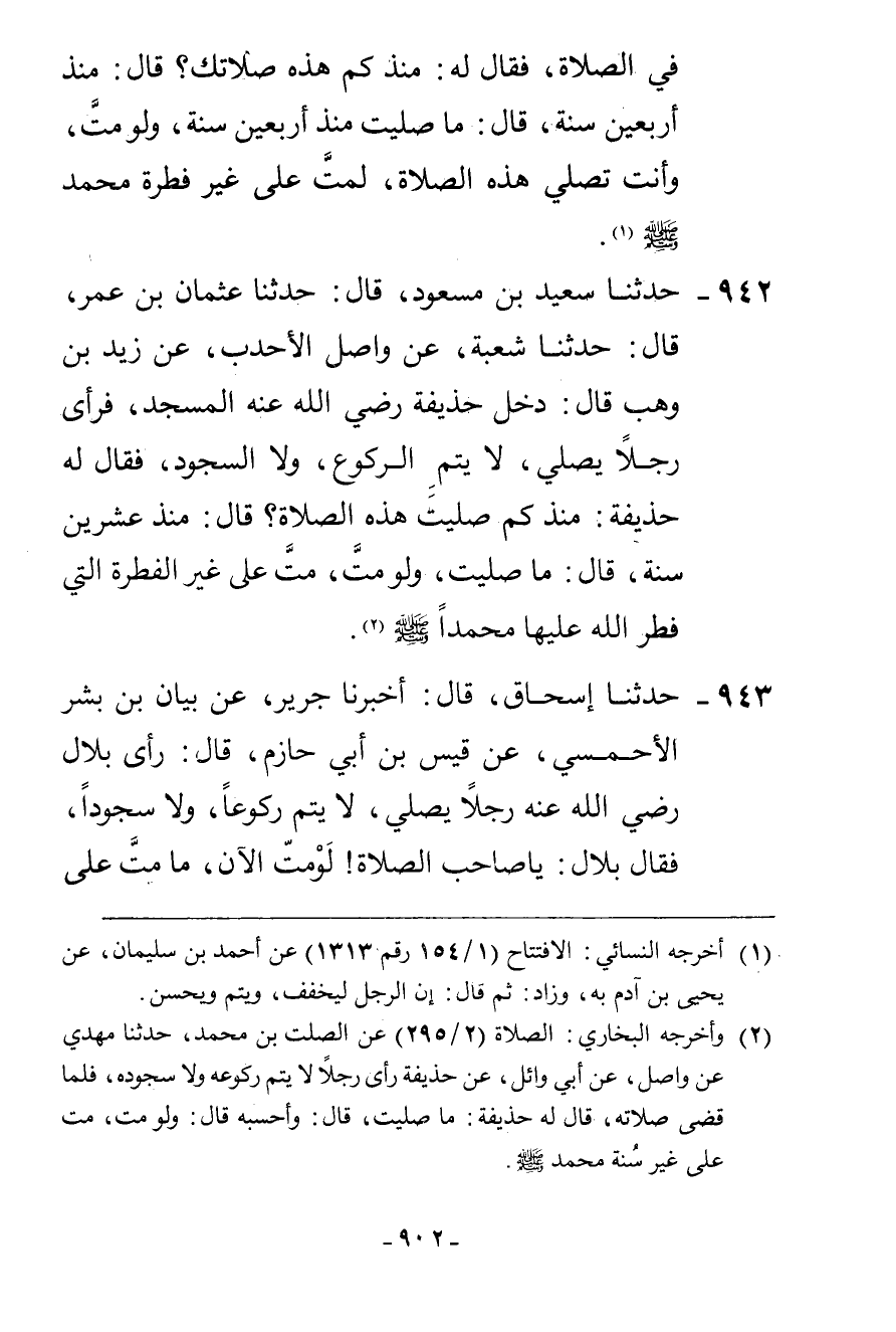 942 - حَدَّثَنَا سَعِيدُ بْنُ مَسْعُودٍ، قَالَ: حَدَّثَنَا عُثْمَانُ بْنُ عُمَرَ، قَالَ: حَدَّثَنَا شُعْبَةُ، عَنْ وَاصِلٍ الْأَحْدَبِ، عَنْ زَيْدِ بْنِ وَهْبٍ، قَالَ: دَخَلَ حُذَيْفَةُ رَضِيَ اللَّهُ عَنْهُ الْمَسْجِدَ فَرَأَى رَجُلًا يُصَلِّي لَا يُتِمُّ الرُّكُوعَ وَلَا السُّجُودَ فَقَالَ لَهُ حُذَيْفَةُ: §مُنْذُ كَمْ صَلَّيْتَ هَذِهِ الصَّلَاةَ قَالَ: مُنْذُ عِشْرِينَ سَنَةً قَالَ: «مَا صَلَّيْتَ وَلَوْ مُتَّ مُتَّ عَلَى غَيْرِ الْفِطْرَةِ الَّتِي فَطَرَ اللَّهُ عَلَيْهَا مُحَمَّدًا صَلَّى اللهُ عَلَيْهِ وَسَلَّمَ»