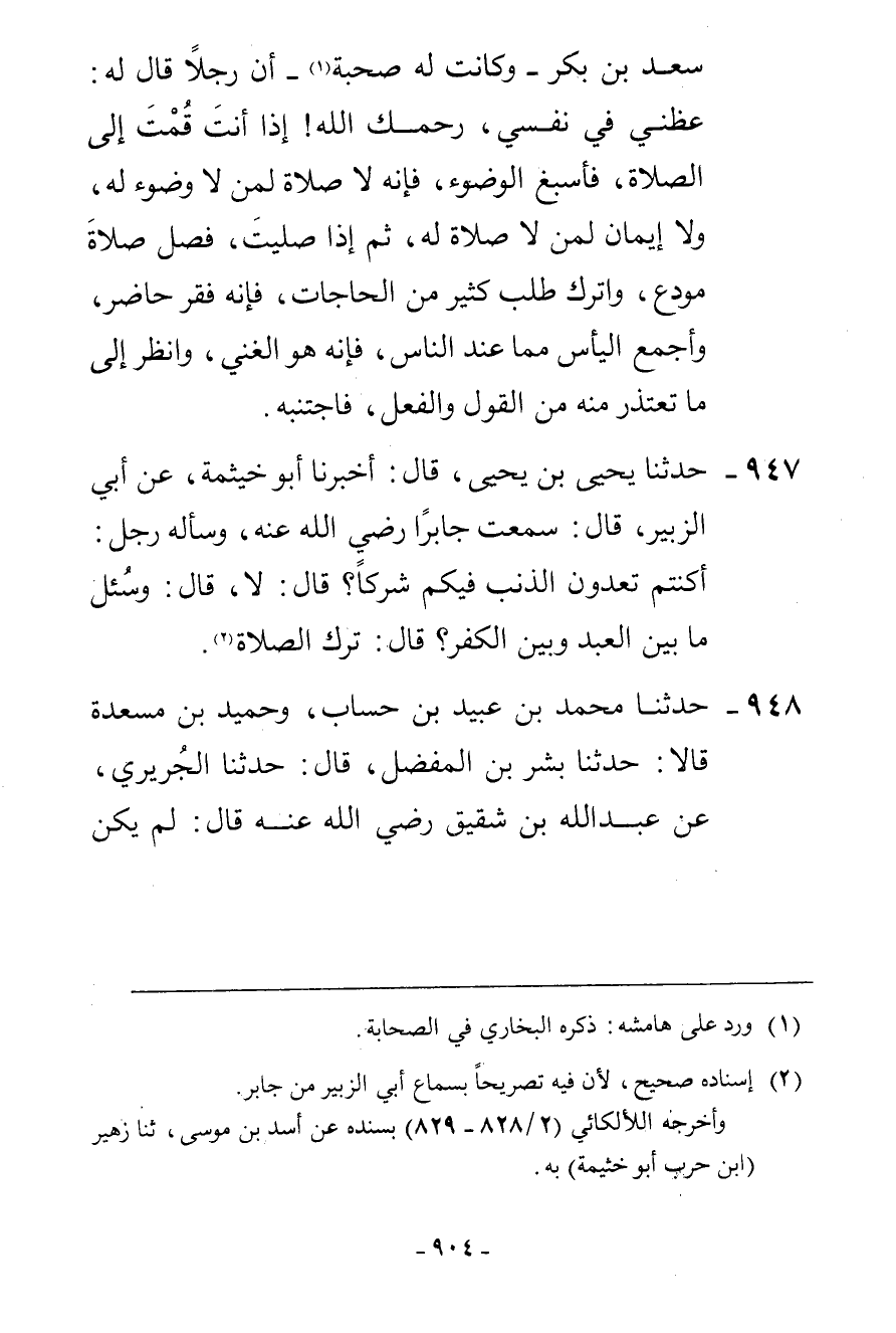 947 - حَدَّثَنَا يَحْيَى بْنُ يَحْيَى، قَالَ: أَخْبَرَنَا أَبُو خَيْثَمَةَ، عَنْ أَبِي الزُّبَيْرِ، قَالَ: سَمِعْتُ جَابِرًا رَضِيَ اللَّهُ عَنْهُ وَسَأَلَهُ رَجُلٌ: §أَكُنْتُمْ تَعُدُّونَ الذَّنْبَ فِيكُمْ شِرْكًا؟ قَالَ: لَا، قَالَ: وَسُئِلَ مَا بَيْنَ الْعَبْدِ وَبَيْنَ الْكُفْرِ قَالَ: تَرْكُ الصَّلَاةِ "