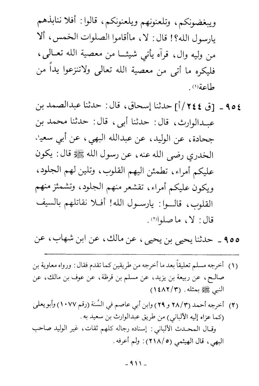 954 - حَدَّثَنَا إِسْحَاقُ، قَالَ: حَدَّثَنَا عَبْدُ الصَّمَدِ بْنُ عَبْدِ الْوَارِثِ، قَالَ: حَدَّثَنَا أَبِي قَالَ: حَدَّثَنَا مُحَمَّدُ بْنُ جُحَادَةَ، عَنِ الْوَلِيدِ، عَنْ عَبْدِ اللَّهِ الْبَهِيِّ، عَنْ أَبِي سَعِيدٍ الْخُدْرِيٍّ رَضِيَ اللَّهُ عَنْهُ عَنْ رَسُولِ اللَّهِ صَلَّى اللهُ عَلَيْهِ وَسَلَّمَ قَالَ: «§يَكُونُ عَلَيْكُمْ أُمَرَاءُ تَطْمَئِنُّ إِلَيْهِمُ الْقُلُوبُ وَتَلِينُ لَهُمُ الْجُلُودُ، وَيَكُونُ عَلَيْكُمْ أُمَرَاءُ تَقْشَعِرُّ مِنْهُمُ الْجُلُودُ وَتَشْمَئِزُّ مِنْهُمُ الْقُلُوبُ» قَالُوا: يَا رَسُولَ اللَّهِ: أَفَلَا نُقَاتِلُهُمْ بِالسَّيْفِ؟ قَالَ: «لَا، مَا صَلَّوْا»