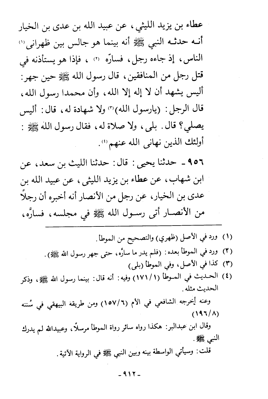 956 - حَدَّثَنَا يَحْيَى، قَالَ: حَدَّثَنَا اللَّيْثُ بْنُ سَعْدٍ، عَنِ ابْنِ شِهَابٍ، عَنْ عَطَاءِ بْنِ يَزِيدَ اللَّيْثِيِّ، عَنْ عُبَيْدِ اللَّهِ بْنِ عَدِيِّ بْنِ الْخِيَارِ، عَنْ رَجُلٍ، مِنَ الْأَنْصَارِ أَنَّهُ أَخْبَرَهُ أَنَّ رَجُلًا مِنَ الْأَنْصَارِ §أَتَى رَسُولَ اللَّهِ صَلَّى اللهُ عَلَيْهِ وَسَلَّمَ فِي مَجْلِسِهِ فَسَارَّهُ يَسْتَأْذِنُهُ فِي قَتْلِ رَجُلٍ مِنَ الْمُنَافِقِينَ فَجَهَرَ رَسُولُ اللَّهِ صَلَّى اللهُ عَلَيْهِ وَسَلَّمَ فَقَالَ: «أَلَيْسَ يَشْهَدُ أَنْ لَا إِلَهَ إِلَّا اللَّهُ؟» قَالَ الْأَنْصَارِيُّ: بَلَى وَلَا شَهَادَةَ لَهُ، قَالَ: «أَلَيْسَ يَشْهَدُ أَنَّ مُحَمَّدًا رَسُولُ اللَّهِ؟» قَالَ الْأَنْصَارِيُّ: بَلَى وَلَا شَهَادَةَ لَهُ، قَالَ: «أَلَيْسَ يُصَلِّي؟» قَالَ: بَلَى وَلَا صَلَاةَ لَهُ، قَالَ رَسُولُ اللَّهِ صَلَّى اللهُ عَلَيْهِ وَسَلَّمَ: «أُولَئِكَ الَّذِينَ نُهِيتُ عَنْهُمْ» .