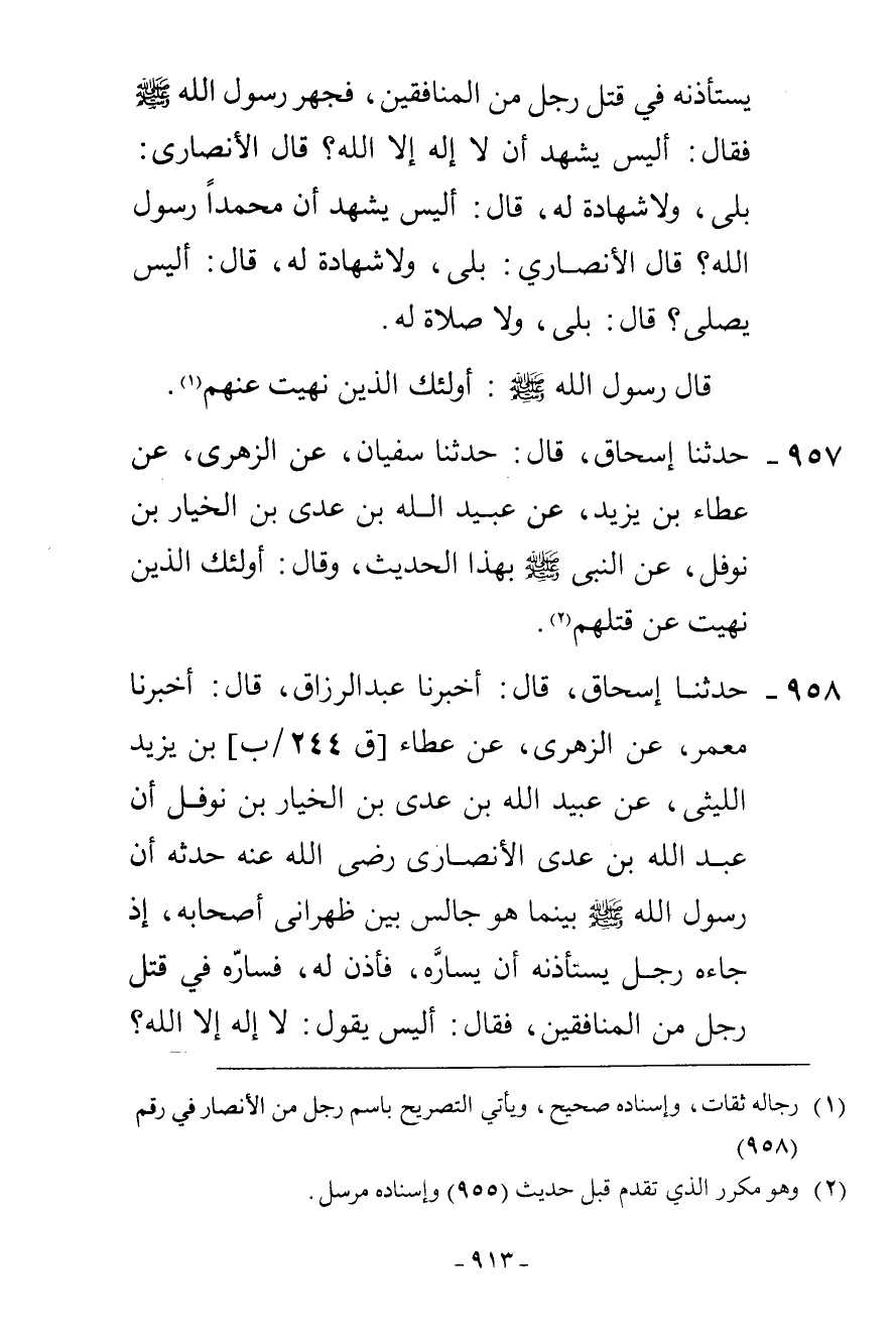 958 - حَدَّثَنَا إِسْحَاقُ، قَالَ: أَخْبَرَنَا عَبْدُ الرَّزَّاقِ، قَالَ: أَخْبَرَنَا مَعْمَرٌ، عَنِ الزُّهْرِيِّ، عَنْ عَطَاءِ بْنِ يَزِيدَ اللَّيْثِيِّ، عَنْ عُبَيْدِ اللَّهِ بْنِ عَدِيِّ بْنِ الْخِيَارِ بْنِ نَوْفَلٍ، أَنَّ عَبْدَ اللَّهِ بْنَ عَدِيٍّ الْأَنْصَارِيَّ رَضِيَ اللَّهُ عَنْهُ حَدَّثَهُ أَنَّ رَسُولَ اللَّهِ صَلَّى اللهُ عَلَيْهِ وَسَلَّمَ §بَيْنَمَا هُوَ جَالِسٌ بَيْنَ ظَهْرَانَيْ أَصْحَابِهِ إِذْ جَاءَهُ رَجُلٌ يَسْتَأْذِنُهُ أَنْ يُسَارَّهُ فَأَذِنَ لَهُ فَسَارَّهُ فِي قَتْلِ رَجُلٍ مِنَ الْمُنَافِقِينَ فَقَالَ: «أَلَيْسَ يَقُولُ لَا إِلَهَ إِلَّا اللَّهُ؟» -[914]- قَالَ: بَلَى، وَلَكِنْ لَا شَهَادَةَ لَهُ، قَالَ: «أَلَيْسَ يَشْهَدُ أَنِّي رَسُولُ اللَّهِ؟» قَالَ: بَلَى، وَلَكِنْ لَا شَهَادَةَ لَهُ، قَالَ: «أَلَيْسَ يُصَلِّي؟» قَالَ: بَلَى لَكِنْ لَا صَلَاةَ لَهُ، فَقَالَ رَسُولُ اللَّهِ صَلَّى اللهُ عَلَيْهِ وَسَلَّمَ: «أُولَئِكَ الَّذِينَ نُهِيتُ عَنْهُمْ» .