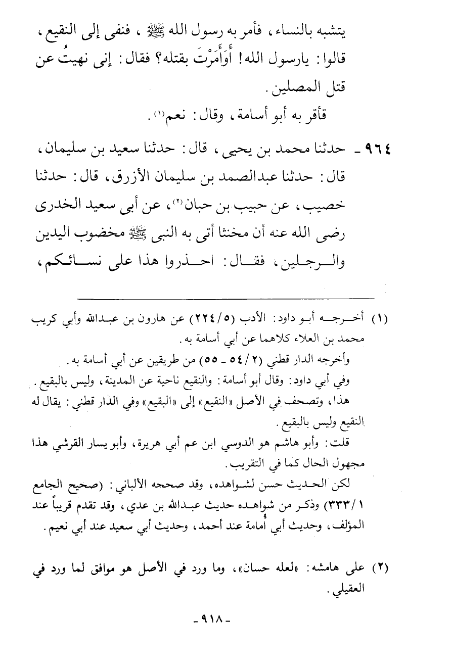 964 - حَدَّثَنَا مُحَمَّدُ بْنُ يَحْيَى، قَالَ: حَدَّثَنَا سَعِيدُ بْنُ سُلَيْمَانَ، قَالَ: حَدَّثَنَا عَبْدُ الصَّمَدِ بْنُ سُلَيْمَانَ الْأَزْرَقُ، قَالَ: حَدَّثَنَا خَصِيبٌ، عَنْ حَبِيبِ بْنِ حِمَازٍ، عَنْ أَبِي سَعِيدٍ الْخُدْرِيِّ رَضِيَ اللَّهُ عَنْهُ §أَنَّ مُخَنَّثًا، أُتِيَ بِهِ النَّبِيُّ صَلَّى اللهُ عَلَيْهِ وَسَلَّمَ مَخْضُوبُ الْيَدَيْنِ وَالرِّجْلَيْنِ فَقَالَ: «احْذَرُوا هَذَا عَلَى نِسَائِكُمْ» قَالُوا: أَفَلَا نَقْتُلُهُ يَا رَسُولَ اللَّهِ؟ قَالَ: «إِنِّي نُهِيتُ عَنْ قَتْلِ الْمُصَلِّينَ»