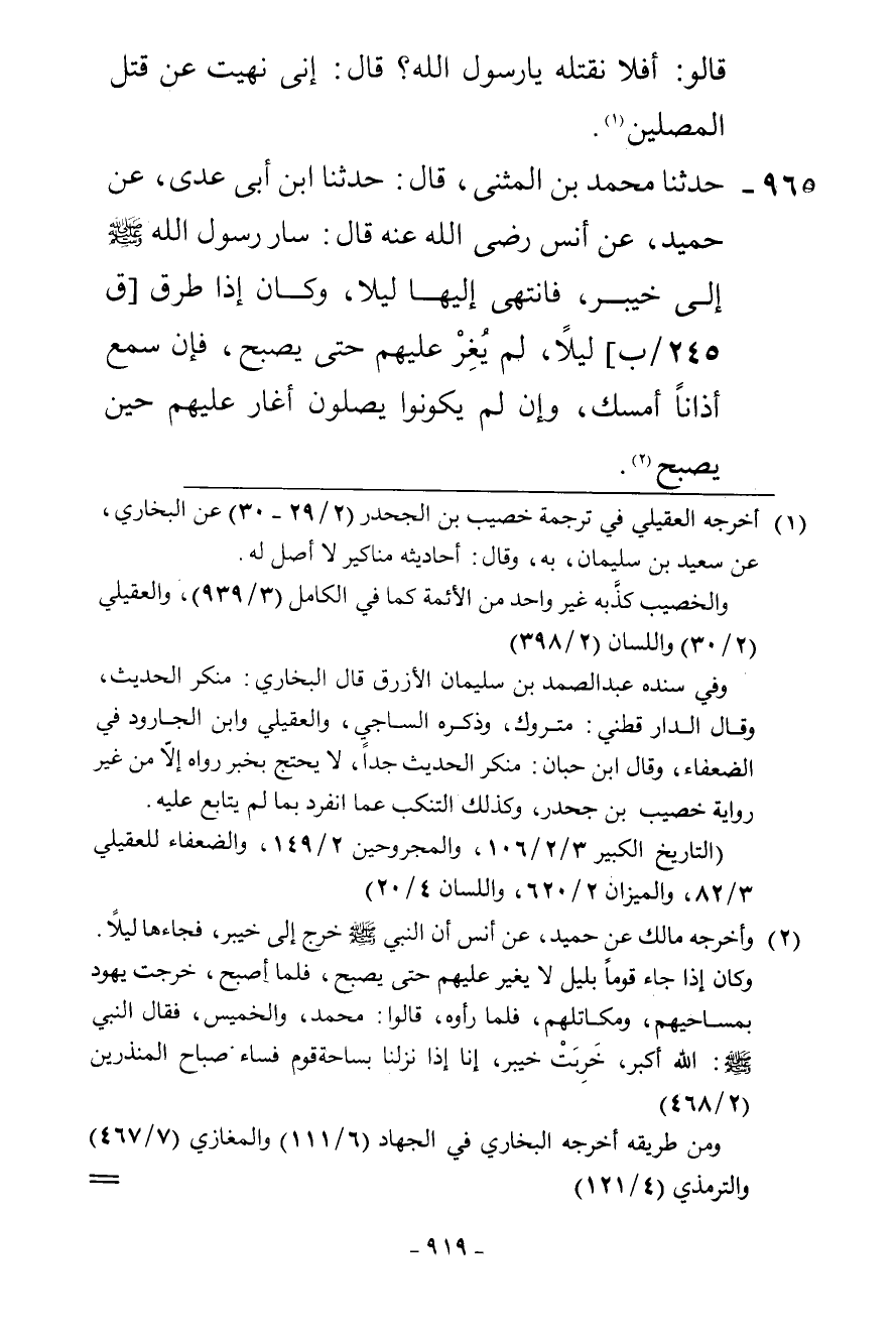 965 - حَدَّثَنَا مُحَمَّدُ بْنُ الْمُثَنَّى، قَالَ: حَدَّثَنَا ابْنُ أَبِي عَدِيٍّ، عَنْ حُمَيْدٍ، عَنْ أَنَسٍ رَضِيَ اللَّهُ عَنْهُ قَالَ: §سَارَ رَسُولُ اللَّهِ صَلَّى اللهُ عَلَيْهِ وَسَلَّمَ إِلَى خَيْبَرَ فَانْتَهَى إِلَيْهَا لَيْلًا، وَكَانَ إِذَا طَرَقَ لَيْلًا لَمْ يُغِرْ عَلَيْهِمْ حَتَّى يُصْبِحَ فَإِنْ سَمِعَ أَذَانًا أَمْسَكَ وَإِنْ لَمْ يَكُونُوا يُصَلُّونَ أَغَارَ عَلَيْهِمْ حِينَ يُصْبِحُ "