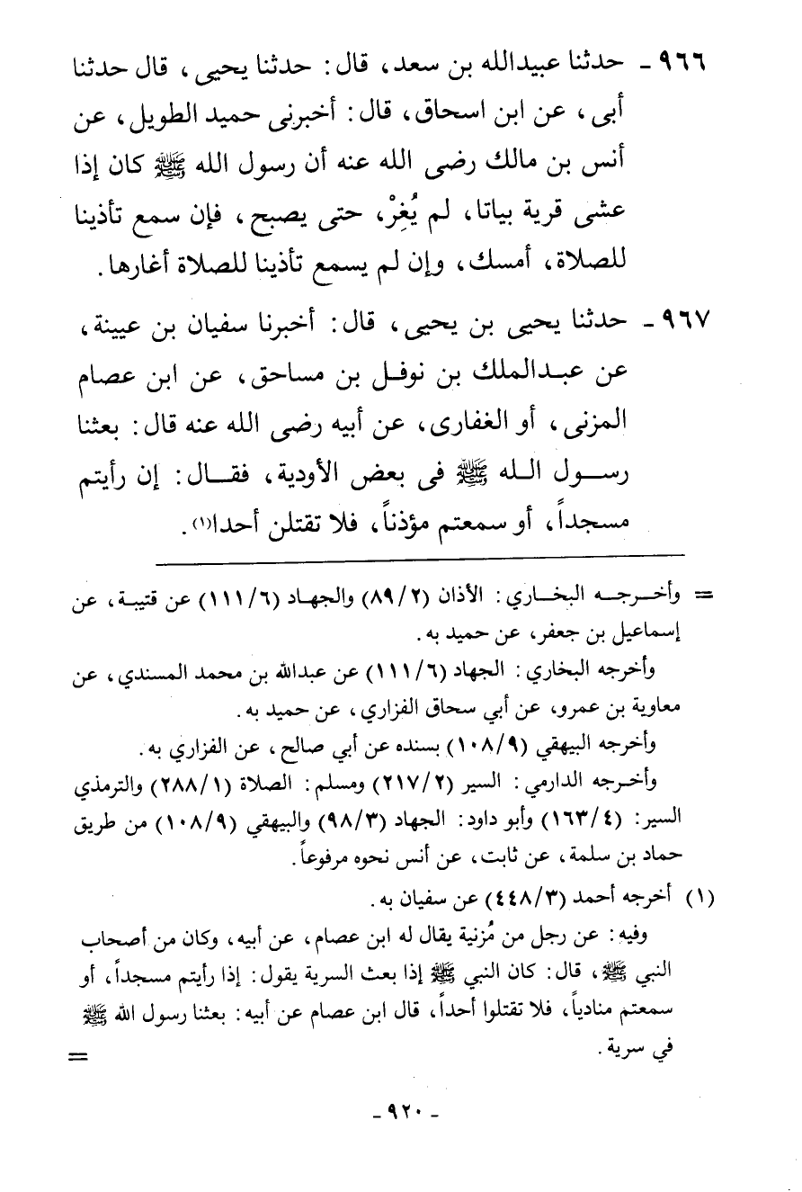 967 - حَدَّثَنَا يَحْيَى بْنُ يَحْيَى، قَالَ: أَخْبَرَنَا سُفْيَانُ بْنُ عُيَيْنَةَ، عَنْ عَبْدِ الْمَلِكِ بْنِ نَوْفَلِ بْنِ مُسَاحِقٍ، عَنِ ابْنِ عِصَامٍ الْمُزَنِيِّ، أَوِ الْغِفَارِيِّ عَنْ أَبِيهِ رَضِيَ اللَّهُ عَنْهُ قَالَ: " بَعَثَنَا رَسُولُ اللَّهِ صَلَّى اللهُ عَلَيْهِ وَسَلَّمَ فِي بَعْضِ الْأَوْدِيَةِ فَقَالَ: «§إِنْ رَأَيْتُمْ مَسْجِدًا أَوْ سَمِعْتُمْ مُؤَذِّنًا فَلَا تَقْتُلُنَّ أَحَدًا»