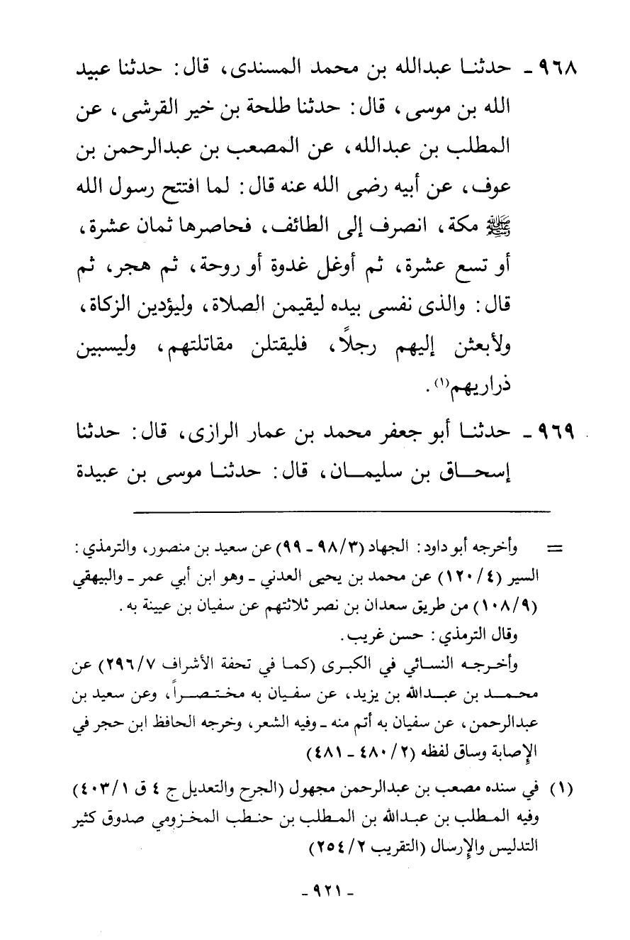 968 - حَدَّثَنَا عَبْدُ اللَّهِ بْنُ مُحَمَّدٍ الْمُسْنَدِيُّ، قَالَ: حَدَّثَنَا عُبَيْدُ اللَّهِ بْنُ مُوسَى، قَالَ: حَدَّثَنَا طَلْحَةُ بْنُ خَيْرٍ الْقُرَشِيُّ، عَنِ الْمُطَّلِبِ بْنِ عَبْدِ اللَّهِ، عَنِ الْمُصْعَبِ بْنِ عَبْدِ الرَّحْمَنِ بْنِ عَوْفٍ، عَنْ أَبِيهِ رَضِيَ اللَّهُ عَنْهُ قَالَ: " §لَمَّا افْتَتَحَ رَسُولُ اللَّهِ صَلَّى اللهُ عَلَيْهِ وَسَلَّمَ مَكَّةَ انْصَرَفَ إِلَى الطَّائِفِ فَحَاصَرَهَا ثَمَانَ عَشْرَةَ أَوْ تِسْعَ عَشْرَةَ ثُمَّ أَوْغَلَ غُدْوَةً أَوْ رَوْحَةً ثُمَّ هَجَرَ ثُمَّ قَالَ: «وَالَّذِي نَفْسِي بِيَدِهِ لَيُقِيمَنَّ الصَّلَاةَ، وَلَيُؤَدِّيَنَّ الزَّكَاةَ، وَلَأَبْعَثَنَّ إِلَيْهِمْ رَجُلًا فَلَيَقْتُلَنَّ مُقَاتِلَتَهُمْ، وَلَيَسْبِيَنَّ ذَرَارِيَّهُمْ»