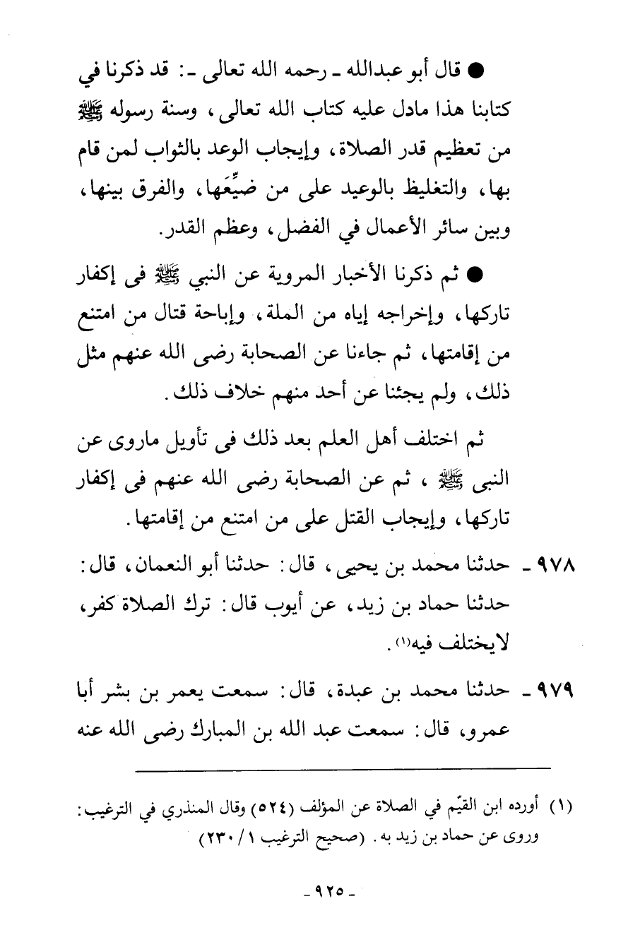 978 - حَدَّثَنَا مُحَمَّدُ بْنُ يَحْيَى، قَالَ: حَدَّثَنَا أَبُو النُّعْمَانِ، قَالَ: حَدَّثَنَا حَمَّادُ بْنُ زَيْدٍ، عَنْ أَيُّوبَ، قَالَ: «§تَرْكُ الصَّلَاةِ كُفْرٌ لَا يُخْتَلَفُ فِيهِ»