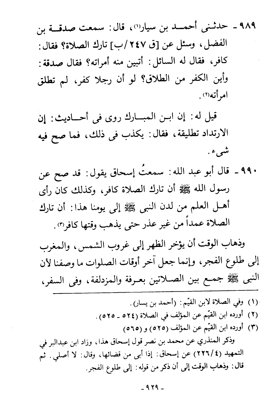 989 - حَدَّثَنِي أَحْمَدُ بْنُ سَيَّارٍ، قَالَ: سَمِعْتُ صَدَقَةَ بْنَ الْفَضْلِ، §وَسُئِلَ، عَنْ تَارِكِ الصَّلَاةِ،؟ فَقَالَ: «كَافِرٌ» ، فَقَالَ لَهُ السَّائِلُ: أَتَبِينُ مِنْهُ امْرَأَتُهُ؟ فَقَالَ صَدَقَةُ: «وَأَيْنَ الْكُفْرُ مِنَ الطَّلَاقِ لَوْ أَنَّ رَجُلًا كَفَرَ لَمْ تُطَلَّقِ امْرَأَتُهُ» ، قِيلَ لَهُ: إِنَّ ابْنَ الْمُبَارَكِ رَوَى فِي أَحَادِيثَ: إِنَّ الِارْتِدَادَ تَطْلِيقَةٌ، فَقَالَ: «يَكْذِبُ فِي ذَلِكَ فَمَا صَحَّ فِيهِ شَيْءٌ»