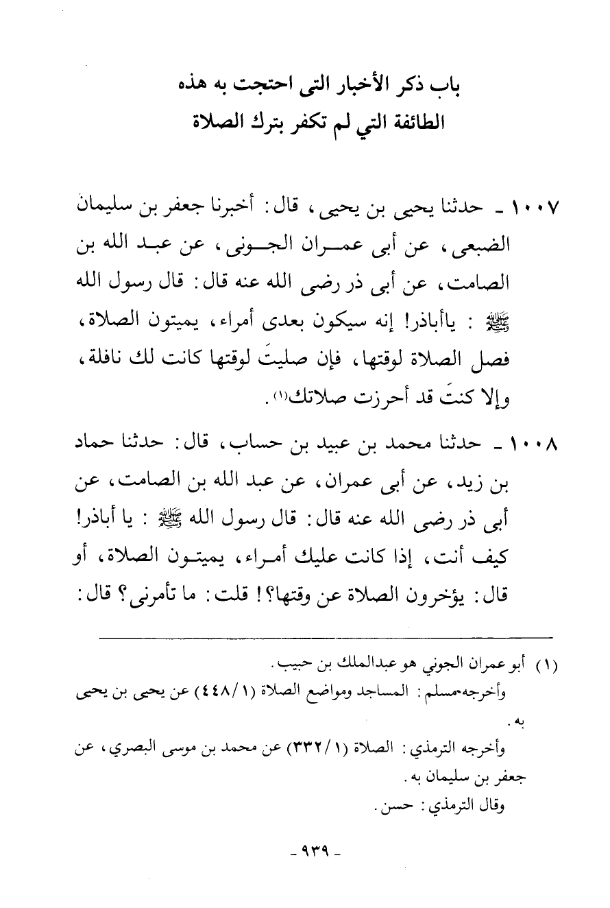 1007 - حَدَّثَنَا يَحْيَى بْنُ يَحْيَى، قَالَ: أَخْبَرَنَا جَعْفَرُ بْنُ سُلَيْمَانَ الضُّبَعِيُّ، عَنْ أَبِي عِمْرَانَ الْجَوْنِيِّ، عَنْ عَبْدِ اللَّهِ بْنِ الصَّامِتِ، عَنْ أَبِي ذَرٍّ، رَضِيَ اللَّهُ عَنْهُ قَالَ: قَالَ رَسُولُ اللَّهِ صَلَّى اللهُ عَلَيْهِ وَسَلَّمَ: «يَا أَبَا ذَرٍّ إِنَّهُ §سَيَكُونُ بَعْدِي أُمَرَاءُ يُمِيتُونَ الصَّلَاةَ فَصَلِّ الصَّلَاةَ لِوَقْتِهَا فَإِنْ صَلَّيْتَ لِوَقْتِهَا كَانَتْ لَكَ نَافِلَةً، وَإِلَّا كُنْتَ قَدْ أَحْرَزْتَ صَلَاتَكَ»