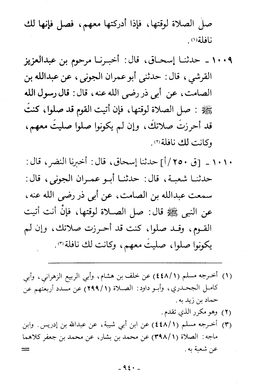1009 - حَدَّثَنَا إِسْحَاقُ، قَالَ: أَخْبَرَنَا مَرْحُومُ بْنُ عَبْدِ الْعَزِيزِ الْقُرَشِيُّ، قَالَ: حَدَّثَنِي أَبُو عِمْرَانَ الْجَوْنِيُّ، عَنْ عَبْدِ اللَّهِ بْنِ الصَّامِتِ، عَنْ أَبِي ذَرٍّ، رَضِيَ اللَّهُ عَنْهُ قَالَ: قَالَ رَسُولُ اللَّهِ صَلَّى اللهُ عَلَيْهِ وَسَلَّمَ: «§صَلِّ الصَّلَاةَ لِوَقْتِهَا فَإِنْ أَتَيْتَ الْقَوْمَ قَدْ صَلُّوا كُنْتَ قَدْ أَحْرَزْتَ صَلَاتَكَ، وَإِنْ لَمْ يَكُونُوا صَلُّوا صَلَّيْتَ مَعَهُمْ وَكَانَتْ لَكَ نَافِلَةً»