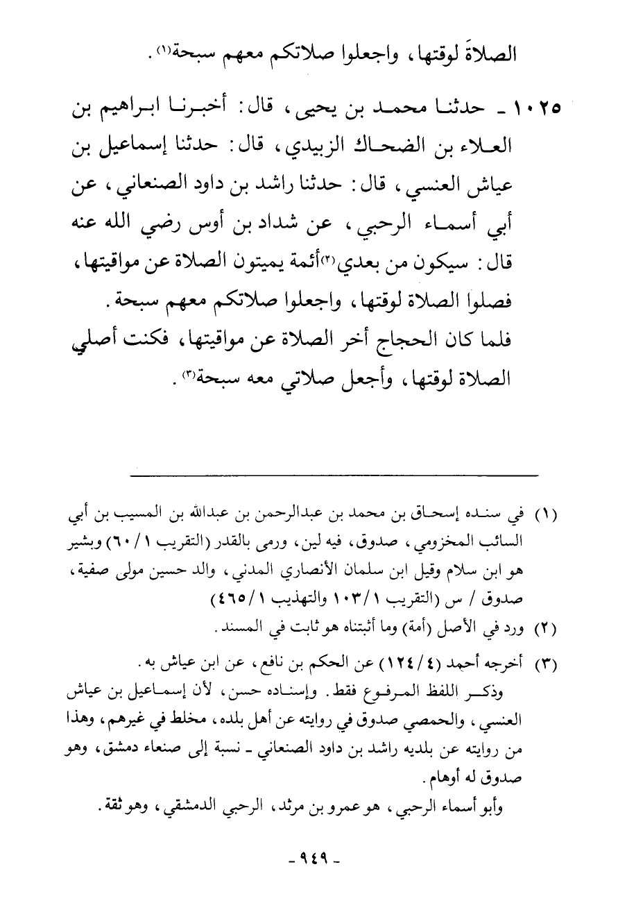 1025 - حَدَّثَنَا مُحَمَّدُ بْنُ يَحْيَى، قَالَ: أَخْبَرَنَا إِبْرَاهِيمُ بْنُ الْعَلَاءِ بْنِ الضَّحَّاكِ الزُّبَيْدِيُّ، قَالَ: حَدَّثَنَا إِسْمَاعِيلُ بْنُ عَيَّاشٍ الْعَنْسِيُّ، قَالَ: حَدَّثَنَا رَاشِدُ بْنُ دَاوُدَ الصَّنْعَانِيُّ، عَنْ أَبِي أَسْمَاءَ الرَّحَبِيِّ، عَنْ شَدَّادِ بْنِ أَوْسٍ، رَضِيَ اللَّهُ عَنْهُ قَالَ: «§سَيَكُونُ مِنْ بَعْدِي أَئِمَّةٌ يُمِيتُونَ الصَّلَاةَ عَنْ مَوَاقِيتِهَا فَصَلُّوا الصَّلَاةَ لِوَقْتِهَا، وَاجْعَلُوا صَلَاتَكُمْ مَعَهُمْ سُبْحَةً» فَلَمَّا كَانَ الْحَجَّاجُ أَخَّرَ الصَّلَاةَ عَنْ مَوَاقِيتِهَا فَكُنْتُ أُصَلِّي الصَّلَاةَ لِوَقْتِهَا وَأَجْعَلُ صَلَاتِي مَعَهُ سُبْحَةً