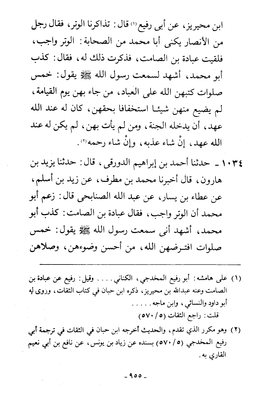 1034 - حَدَّثَنَا أَحْمَدُ بْنُ إِبْرَاهِيمَ الدَّوْرَقِيُّ، قَالَ: حَدَّثَنَا يَزِيدُ بْنُ هَارُونَ، قَالَ: أَخْبَرَنَا مُحَمَّدُ بْنُ مُطَرِّفٍ، عَنْ زَيْدِ بْنِ أَسْلَمَ، عَنْ عَطَاءِ بْنِ يَسَارٍ، عَنْ عَبْدِ اللَّهِ الصُّنَابِحِيّ، قَالَ: زَعَمَ أَبُو مُحَمَّدٍ أَنَّ الْوِتْرَ، وَاجِبٌ، فَقَالَ عُبَادَةُ بْنُ الصَّامِتِ: كَذَبَ أَبُو مُحَمَّدٍ، أَشْهَدُ أَنِّي سَمِعْتُ رَسُولَ اللَّهِ صَلَّى اللهُ عَلَيْهِ وَسَلَّمَ يَقُولُ: «§خَمْسُ صَلَوَاتٍ افْتَرَضَهُنَّ اللَّهُ مَنْ أَحْسَنَ وضُوءَهُنَّ وَصَلَّاهُنَّ -[956]- لِوَقْتِهِنَّ وَأَتَمَّ رُكُوعَهُنَّ وَخُشُوعَهُنَّ كَانَ لَهُ عِنْدَ اللَّهِ عَهْدٌ أَنْ يَغْفِرَ لَهُ، وَمَنْ لَمْ يَفْعَلْ جَاءَ وَلَيْسَ لَهُ عِنْدَ اللَّهِ عَهْدٌ إِنْ شَاءَ غَفَرَ لَهُ، وَإِنْ شَاءَ عَذَّبَهُ» قَالَ أَبُو عَبْدِ اللَّهِ رَحِمَهُ اللَّهُ: وَاحْتَجُّوا بِهَذِهِ الْأَخْبَارِ وَجَعَلُوهَا مُعَارِضَةً لِتِلْكَ الْأَخْبَارِ الَّتِي جَاءَتْ فِي إِكْفَارِ تَارِكِ الصَّلَاةِ. قَالُوا: فَهَذِهِ الْأَخْبَارُ تَدُلُّ عَلَى أَنَّ تَارِكَ الصَّلَاةِ حَتَّى تُجَاوِزَ وَقْتَهَا غَيْرَ كَافِرٍ. قَالُوا: وَفِي اتِّفَاقِ عَامَّةِ أَهْلِ الْعِلْمِ عَلَى أَنَّ التَّارِكَ لِلصَّلَاةِ حَتَّى خَرَجَ وَقْتُهَا مُتَعَمِّدًا يُعِيدُهَا قَضَاءً، مَا يَدُلُّ عَلَى أَنَّهُ لَيْسَ بِكَافِرٍ لِأَنَّ الْكَافِرَ لَا يُؤْمَرُ بِقَضَاءِ مَا تَرَكَ مِنَ الصَّلَاةِ فِي قَوْلِ عَامَّةِ الْعُلَمَاءِ. وَكَانَ مِمَّنْ ذَهَبَ هَذَا الْمَذْهَبَ مِنْ عُلَمَاءِ أَصْحَابِ الْحَدِيثِ الشَّافِعِيُّ رَضِيَ اللَّهُ عَنْهُ وَأَصْحَابُهُ أَبُو ثَوْرٍ وَغَيْرُهُ، وَأَبُو عُبَيْدٍ فِي مُوَافِقِيهِمْ. قَالَ أَبُو عَبْدِ اللَّهِ