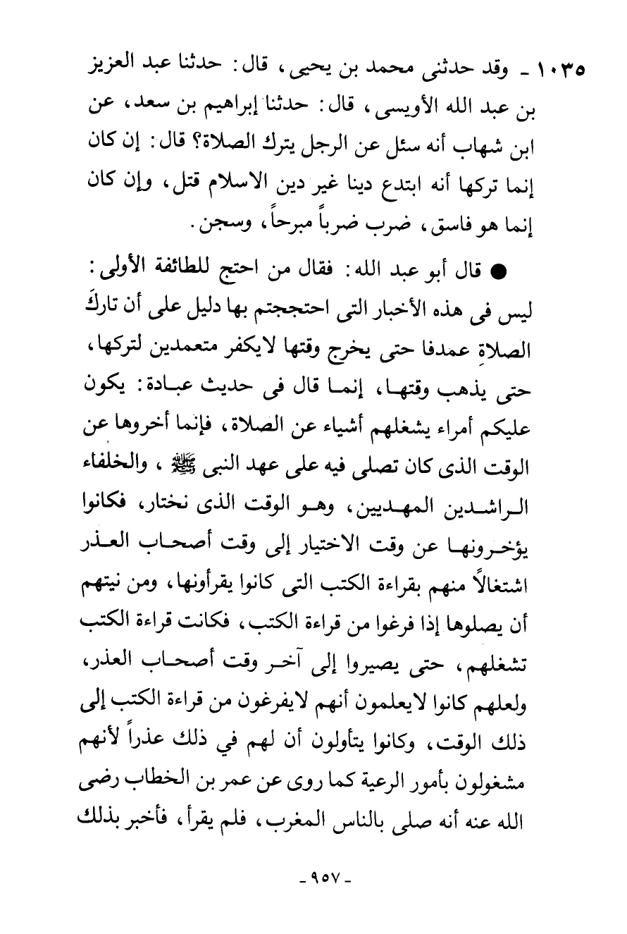 1035 - وَقَدْ حَدَّثَنِي مُحَمَّدُ بْنُ يَحْيَى، قَالَ: حَدَّثَنَا عَبْدُ الْعَزِيزِ بْنُ عَبْدِ اللَّهِ الْأُوَيْسِيُّ، قَالَ: حَدَّثَنَا إِبْرَاهِيمُ بْنُ سَعْدٍ، عَنِ ابْنِ شِهَابٍ، أَنَّهُ سُئِلَ عَنِ §الرَّجُلِ، يَتْرُكُ الصَّلَاةَ؟ قَالَ: «إِنْ كَانَ إِنَّمَا تَرَكَهَا أَنَّهُ ابْتَدَعَ دِينًا غَيْرَ دِينِ الْإِسْلَامِ قُتِلَ، وَإِنْ كَانَ إِنَّمَا هُوَ فَاسِقٌ ضُرِبَ ضَرْبًا مُبَرِّحًا وَسُجِنَ» قَالَ أَبُو عَبْدِ اللَّهِ: فَقَالَ مَنِ احْتَجَّ لِلطَّائِفَةِ الْأُولَى لَيْسَ فِي هَذِهِ الْأَخْبَارِ الَّتِي احْتَجَجْتُمْ بِهَا دَلِيلٌ عَلَى أَنَّ تَارِكَ الصَّلَاةِ عَمْدًا حَتَّى يَخْرُجَ وَقْتُهَا لَا يَكْفُرُ مُتَعَمِّدِينَ لِتَرْكِهَا حَتَّى يَذْهَبَ وَقْتُهَا، إِنَّمَا قَالَ فِي حَدِيثِ عُبَادَةَ: «يَكُونُ عَلَيْكُمْ أُمَرَاءُ يَشْغَلُهُمْ أَشْيَاءُ عَنِ الصَّلَاةِ» فَإِنَّمَا أَخَّرُوهَا عَنِ الْوَقْتِ الَّذِي كَانَ تُصَلَّى فِيهِ عَلَى عَهْدِ النَّبِيِّ صَلَّى اللهُ عَلَيْهِ وَسَلَّمَ وَالْخُلَفَاءِ الرَّاشِدِينَ الْمَهْدِيِّينَ وَهُوَ الْوَقْتُ الَّذِي نَخْتَارُ فَكَانُوا يُؤَخِّرُونَهَا عَنْ وَقْتِ الِاخْتِيَارِ إِلَى وَقْتِ أَصْحَابِ الْعُذْرِ اشْتِغَالًا مِنْهُمْ بِقِرَاءَةِ الْكُتُبِ الَّتِي كَانُوا يَقْرَءُونَهَا، وَمَنْ نِيَّتُهُمْ أَنْ يُصَلُّوهَا إِذَا فَرَغُوا مِنْ قِرَاءَةِ الْكُتُبِ فَكَانَتْ قِرَاءَةُ الْكُتُبِ تَشْغَلُهُمْ حَتَّى يَصِيرُوا إِلَى آخِرِ وَقْتِ أَصْحَابِ الْعُذْرِ، وَلَعَلَّهُمْ كَانُوا لَا يَعْلَمُونَ أَنَّهُمْ لَا يَفْرُغُونَ مِنْ قِرَاءَةِ الْكُتُبِ إِلَى ذَلِكَ الْوَقْتِ وَكَانُوا يَتَأَوَّلُونَ أَنَّ لَهُمْ فِي ذَلِكَ عُذْرًا لِأَنَّهُمْ مَشْغُولُونَ بِأُمُورِ الرَّعِيَّةِ كَمَا رُوِي عَنْ عُمَرَ بْنِ الْخَطَّابٍ رَضِيَ اللَّهُ عَنْهُ أَنَّهُ صَلَّى بِالنَّاسِ الْمَغْرِبَ فَلَمْ يَقْرَأْ فَأُخْبِرَ بِذَلِكَ -[958]- بَعْدَ أَنْ فَرَغَ مِنَ الصَّلَاةِ وَلَمْ يَعْلَمْ بِأَنَّهُ قَدْ تَرَكَ الْقِرَاءَةَ اشْتِغَالًا مِنْهُ بِالتَّفَكُّرِ فِي أَمْرِ الرَّعِيَّةِ