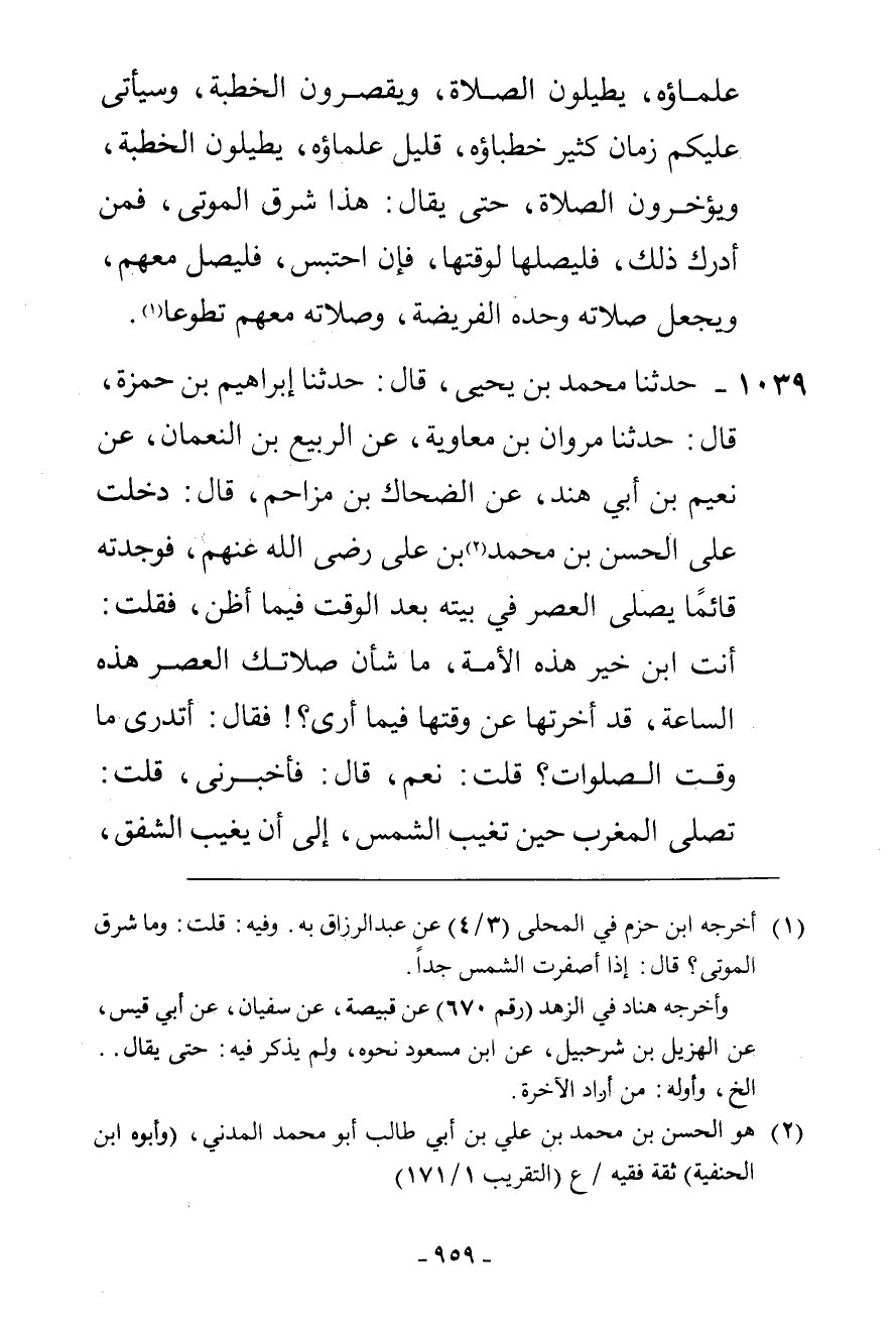 1039 - حَدَّثَنَا مُحَمَّدُ بْنُ يَحْيَى، قَالَ: حَدَّثَنَا إِبْرَاهِيمُ بْنُ حَمْزَةَ، قَالَ: حَدَّثَنَا مَرْوَانُ بْنُ مُعَاوِيَةَ، عَنِ الرَّبِيعِ بْنِ النُّعْمَانِ، عَنْ نُعَيْمِ بْنِ أَبِي هِنْدٍ، عَنِ الضَّحَّاكِ بْنِ مُزَاحِمٍ، قَالَ: §دَخَلْتُ عَلَى الْحَسَنِ بْنِ مُحَمَّدِ بْنِ عَلِيٍّ رَضِيَ اللَّهُ عَنْهُمْ فَوَجَدْتُهُ قَائِمًا يُصَلِّي الْعَصْرَ فِي بَيْتِهِ بَعْدَ الْوَقْتِ فِيمَا أَظُنُّ فَقُلْتُ: أَنْتَ ابْنُ خَيْرِ هَذِهِ الْأُمَّةِ مَا شَأْنُ صَلَاتِكَ الْعَصْرَ هَذِهِ السَّاعَةَ قَدْ أَخَّرْتَهَا عَنْ وَقْتِهَا فِيمَا أَرَى، فَقَالَ: أَتَدْرِي مَا وَقْتُ الصَّلَوَاتِ؟ قُلْتُ: نَعَمْ، قَالَ: فَأَخْبِرْنِي، قُلْتُ: تُصَلِّي الْمَغْرِبَ حِينَ تَغِيبُ الشَّمْسُ إِلَى أَنْ يَغِيبَ الشَّفَقُ -[960]- وَتُصَلِّي الْعِشَاءَ حِينَ يَغِيبُ الشَّفَقُ إِلَى ثُلُثِ اللَّيْلِ الْأَوَّلِ وَتُصَلِّي الصُّبْحَ مِنْ طُلُوعِ الْفَجْرِ إِلَى أَنْ تَطْلُعَ الشَّمْسُ، وَتُصَلِّي الظُّهْرَ حِينَ يَفِيءُ الْفَيْءُ إِلَى اعْتِدَالِ الظِّلِّ، وَتُصَلِّي الْعَصْرَ وَالشَّمْسُ بَيْضَاءُ نَقِيَّةٌ، فَقَالَ الْحَسَنُ رَضِيَ اللَّهُ عَنْهُ: أَجَعَلْتَ الصَّلَوَاتَ كُلَّهُنَّ وَقْتَيْنِ اثْنَيْنِ إِلَّا الصَّلَاةَ الْوُسْطَى وَقْتًا وَاحِدًا لَا يَكُونُ هَذَا أَبَدًا، فَقُلْتُ: وَاللَّهِ مَا عِنْدِي فِيهَا إِلَّا هَذَا فَهَاتِ أَنْتَ مَا عِنْدَكَ فِيهَا، فَقَالَ: نَعَمْ، وَالشَّمْسُ بَيْضَاءُ نَقِيَّةٌ، كَمَا قُلْتَ إِلَى شَرَقِ الْمَوْتَى، فَقُلْتُ: وَمَا يُدْرِينِي مَا شَرَقُ الْمَوْتَى؟ فَقَالَ: أَنَا أُخْبِرُكَ عَنْ ذَلِكَ أَلَمْ تَرَ حِينَ تَسْقُطُ الشَّمْسُ عَنِ الْجَدْرِ فَتَرَاهَا عَلَى الْقُبُورِ كَأَنَّهَا لُجَّةٌ فِي هَيْئَتِهَا فَإِنَّ أَهْلَ الْجَاهِلِيَّةِ كَانُوا يَدْعُونَ تِلْكَ السَّاعَةَ شَرَقَ الْمَوْتَى "