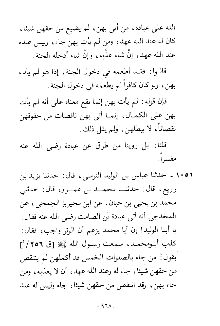 1051 - حَدَّثَنَا عَبَّاسُ بْنُ الْوَلِيدِ النَّرْسِيُّ، قَالَ: حَدَّثَنَا يَزِيدُ بْنُ زُرَيْعٍ، قَالَ: حَدَّثَنَا مُحَمَّدُ بْنُ عَمْرٍو، قَالَ: حَدَّثَنِي مُحَمَّدُ بْنُ يَحْيَى بْنِ حِبَّانَ، عَنِ ابْنِ مُحَيْرِيزِ الْجُمَحِيِّ، عَنِ الْمُخْدَجِيِّ، أَنَّهُ أَتَى عُبَادَةَ بْنَ الصَّامِتٍ رَضِيَ اللَّهُ عَنْهُ، فَقَالَ: يَا أَبَا الْوَلِيدِ إِنَّ أَبَا مُحَمَّدٍ يَزْعُمُ أَنَّ الْوِتْرَ، وَاجِبٌ، فَقَالَ: كَذَبَ أَبُو مُحَمَّدٍ، سَمِعْتُ رَسُولَ اللَّهِ صَلَّى اللهُ عَلَيْهِ وَسَلَّمَ يَقُولُ: «§مَنْ جَاءَ بِالصَّلَوَاتِ الْخَمْسِ قَدْ أَكْمَلَهُنَّ لَمْ يَنْتَقِصْ مِنْ حَقِّهِنَّ شَيْئًا جَاءَ لَهُ وَعِنْدَ اللَّهِ عَهْدٌ أَنْ لَا يُعَذِّبُهُ، وَمَنْ جَاءَ بِهِنَّ وَقَدِ انْتَقَصَ مِنْ حَقِّهِنَّ شَيْئًا جَاءَ وَلَيْسَ لَهُ عِنْدَ -[969]- اللَّهِ عَهْدٌ إِنْ شَاءَ عَذَّبَهُ وَإِنْ شَاءَ رَحِمَهُ» قَالَ أَبُو عَبْدِ اللَّهِ: فَقَالَ مَنْ جَاءَ بِهِنَّ قَدِ انْتَقَصَ مِنْ حَقِّهِنَّ، فَأَخْبَرَ أَنَّهُ قَدْ أَتَى بِهِنَّ نَاقِصَاتٍ مِنْ حُقُوقِهِنَّ