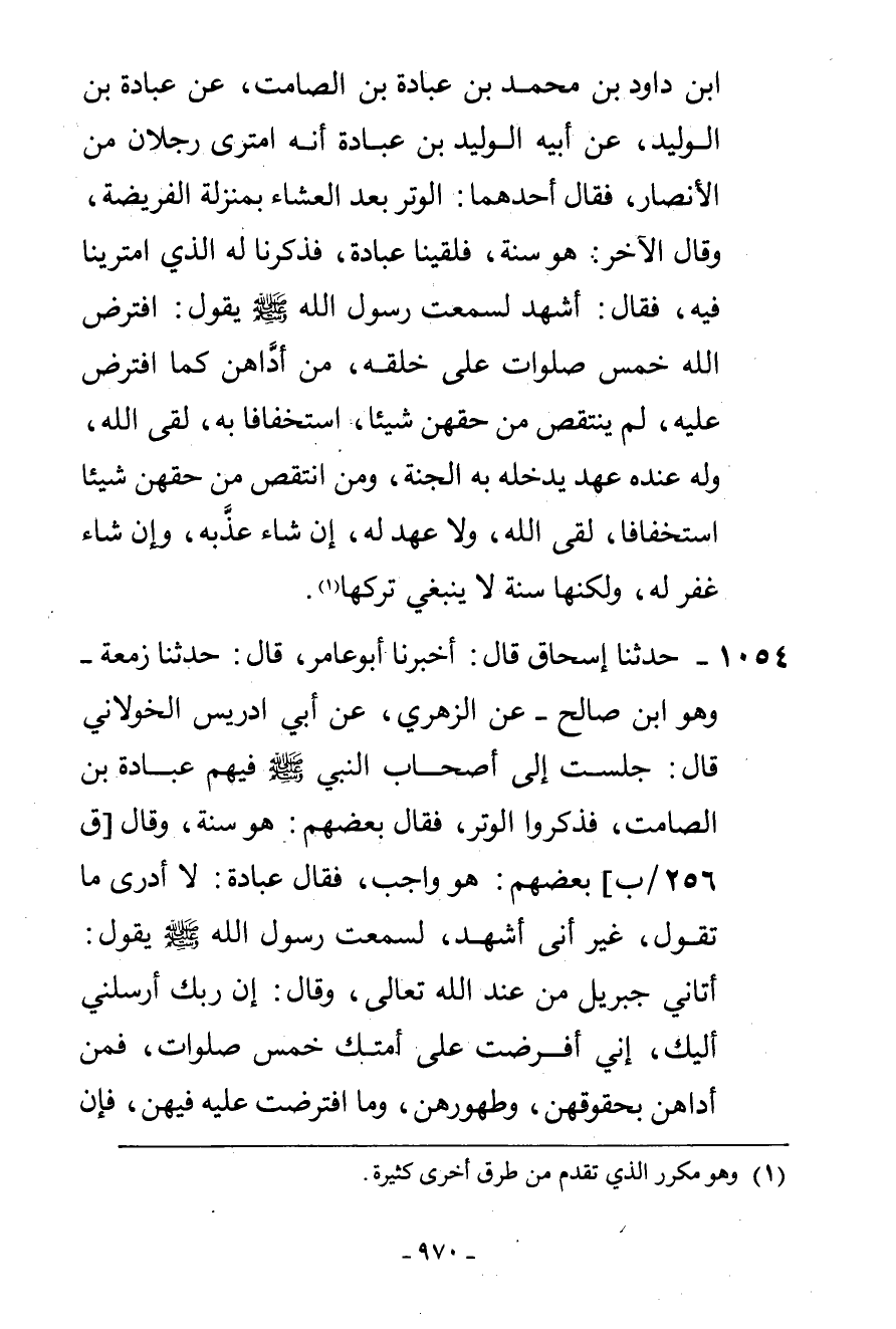 1054 - حَدَّثَنَا إِسْحَاقُ، قَالَ: أَخْبَرَنَا أَبُو عَامِرٍ قَالَ: حَدَّثَنَا زَمْعَةُ وَهُوَ ابْنُ صَالِحٍ، عَنِ الزُّهْرِيِّ، عَنْ أَبِي إِدْرِيسَ الْخَوْلَانِيِّ، قَالَ: جَلَسْتُ إِلَى أَصْحَابِ النَّبِيِّ صَلَّى اللهُ عَلَيْهِ وَسَلَّمَ فِيهِمْ عُبَادَةُ بْنُ الصَّامِتِ فَذَكَرُوا الْوِتْرَ فَقَالَ بَعْضُهُمْ: هُوَ سُنَّةٌ، وَقَالَ بَعْضُهُمْ: هُوَ وَاجِبٌ، فَقَالَ عُبَادَةُ: لَا أَدْرِي مَا تَقُولُ غَيْرَ أَنِّي أَشْهَدُ لَسَمِعْتُ رَسُولَ اللَّهِ صَلَّى اللهُ عَلَيْهِ وَسَلَّمَ يَقُولُ: " §أَتَانِي جِبْرِيلُ مِنْ عِنْدِ اللَّهِ تَعَالَى وَقَالَ: إِنَّ رَبَّكَ أَرْسَلَنِي إِلَيْكَ إِنِّي أَفْرَضْتُ عَلَى أُمَّتِكَ خَمْسَ صَلَوَاتٍ فَمَنْ أَدَّاهُنَّ بِحُقُوقِهِنَّ وَطُهُورِهِنَّ، وَمَا افْتَرَضْتُ عَلَيْهِ فِيهِنَّ، فَإِنَّ لَهُ عَهْدًا أَنْ أُدْخِلَهُ الْجَنَّةَ، وَمَنِ انْتَقَصَ مِنْ حُقُوقِهِنَّ شَيْئًا فَلَا عَهْدَ لَهُ عَلَيَّ، إِنْ شِئْتُ عَذَّبْتُهُ، وَإِنْ شِئْتُ غَفَرْتُ لَهُ "