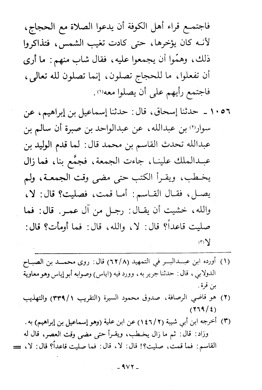 1056 - حَدَّثَنَا إِسْحَاقُ، قَالَ: حَدَّثَنَا إِسْمَاعِيلُ بْنُ إِبْرَاهِيمَ، عَنْ سَوَّارِ بْنِ عَبْدِ اللَّهِ، عَنْ عَبْدِ الْوَاحِدِ بْنِ صَبِرَةَ، أَنَّ سَالِمَ بْنَ عَبْدِ اللَّهِ، تَحَدَّثَ الْقَاسِمَ بْنَ مُحَمَّدٍ قَالَ: §لَمَّا قَدِمَ الْوَلِيدُ بْنُ عَبْدِ الْمَلِكِ عَلَيْنَا جَاءَتِ الْجُمُعَةُ فَجَمَعَ بِنَا فَمَا زَالَ يَخْطُبُ، وَيَقْرَأُ الْكُتُبَ حَتَّى مَضَى وَقْتُ الْجُمُعَةِ وَلَمْ يُصَلِّ، فَقَالَ الْقَاسِمُ: أَمَا قُمْتَ فَصَلَّيْتَ، قَالَ: لَا، وَاللَّهِ خَشِيتُ أَنْ يُقَالَ رَجُلٌ مِنْ آلِ عُمَرَ قَالَ: فَمَا صَلَّيْتَ قَاعِدًا قَالَ: لَا، وَاللَّهِ قَالَ: فَمَا أَوْمَأْتَ قَالَ: لَا "