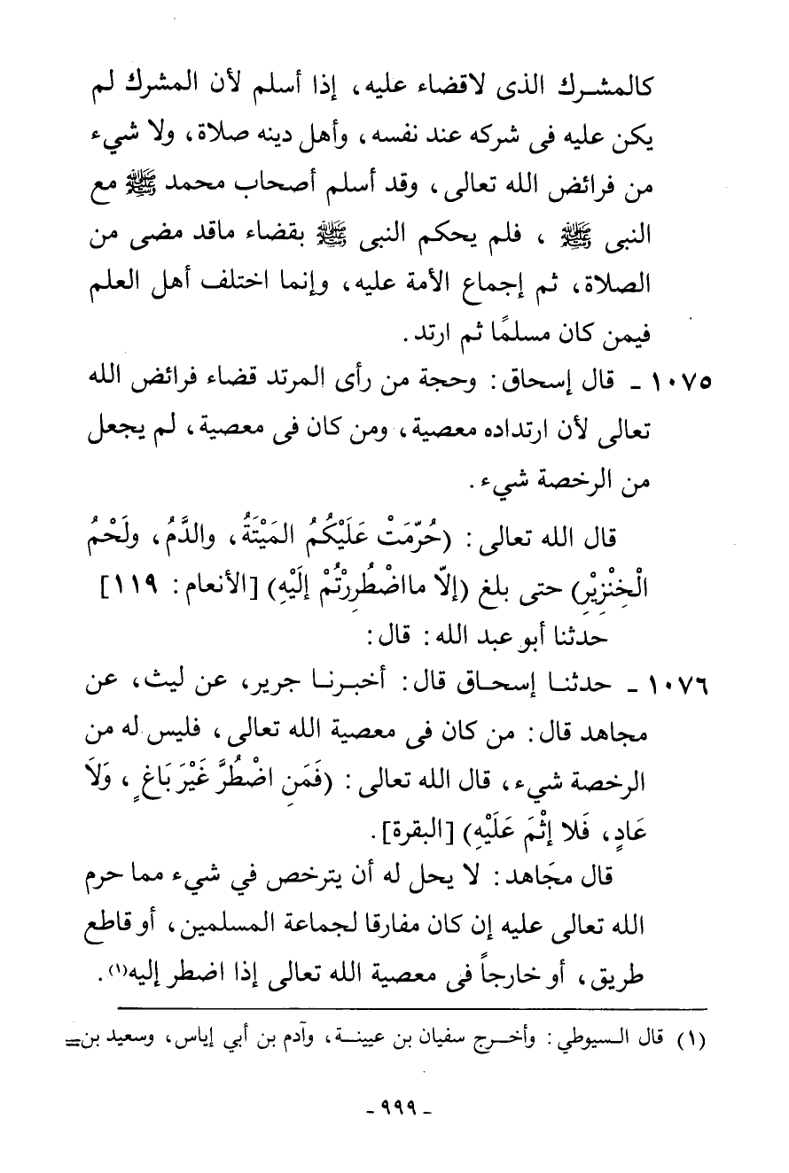 1076 - حَدَّثَنَا إِسْحَاقُ، قَالَ: أَخْبَرَنَا جَرِيرٌ، عَنْ لَيْثٍ، عَنْ مُجَاهِدٍ، قَالَ: " §مَنْ كَانَ فِي مَعْصِيَةِ اللَّهِ تَعَالَى فَلَيْسَ لَهُ مِنَ الرُّخْصَةِ شَيْءٌ قَالَ اللَّهُ تَعَالَى: {فَمَنِ اضْطُرَّ غَيْرَ بَاغٍ وَلَا عَادٍ فَلَا إِثْمَ عَلَيْهِ} [البقرة: 173] قَالَ مُجَاهِدٌ: «لَا يَحِلُّ لَهُ أَنْ يَتَرَخَّصَ فِي شَيْءٍ مِمَّا حَرَّمَ اللَّهُ تَعَالَى عَلَيْهِ إِنْ كَانَ مُفَارِقًا لِجَمَاعَةِ الْمُسْلِمِينَ، أَوْ قَاطَعَ طَرِيقٍ، أَوْ خَارِجًا فِي مَعْصِيَةِ اللَّهِ تَعَالَى إِذَا اضْطُرَّ إِلَيْهِ»