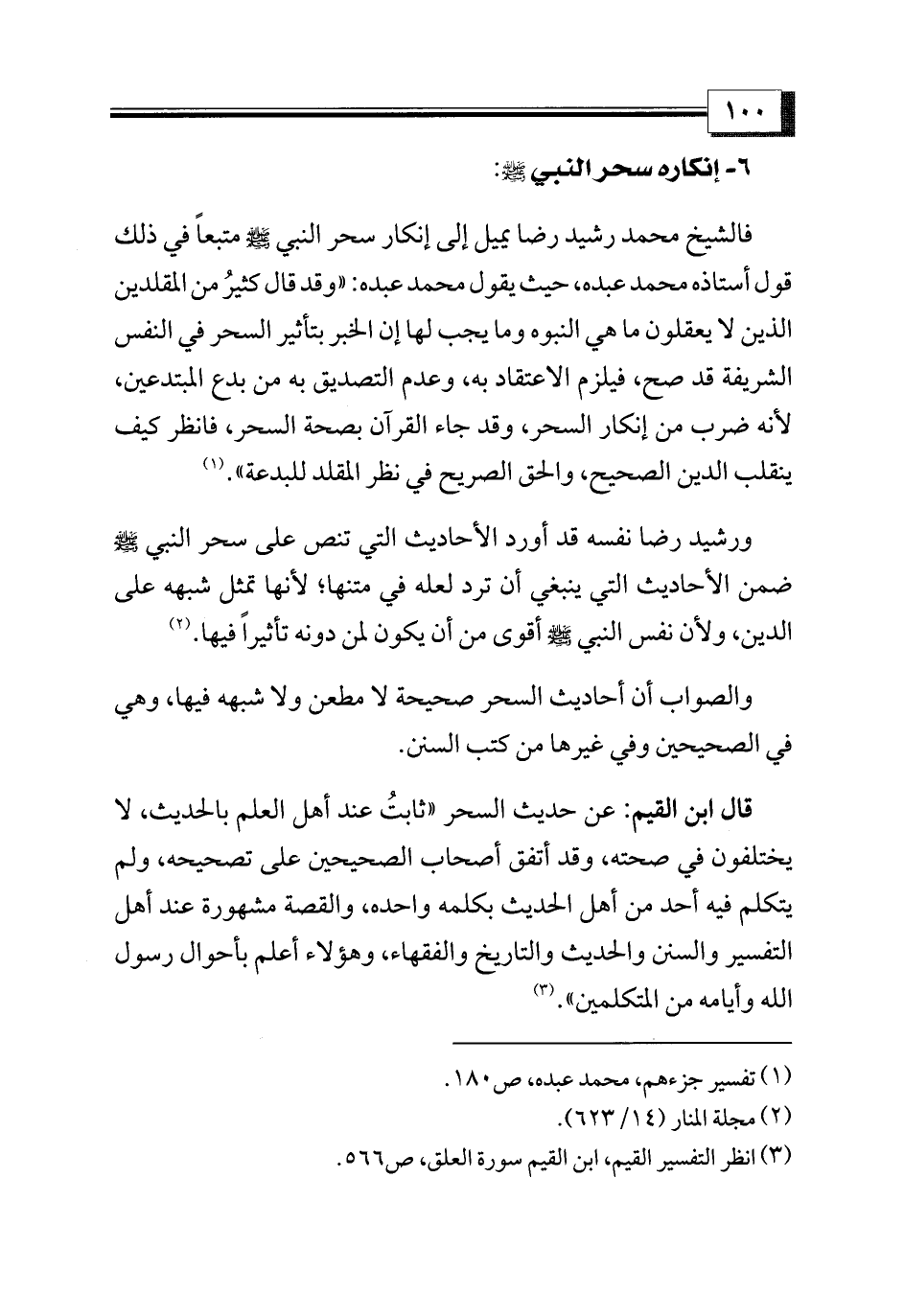 ورشيد رضا نفسه قد أورد الأحاديث التي تنص على سحر النبي - صلى الله عليه وسلم - ضمن الأحاديث التي ينبغي أن ترد لعله في متنها؛ لأنها تمثل شبهه على الدين، ولأن نفس النبي - صلى الله عليه وسلم - أقوى من أن يكون لمن دونه تأثيراً فيها. (¬2)