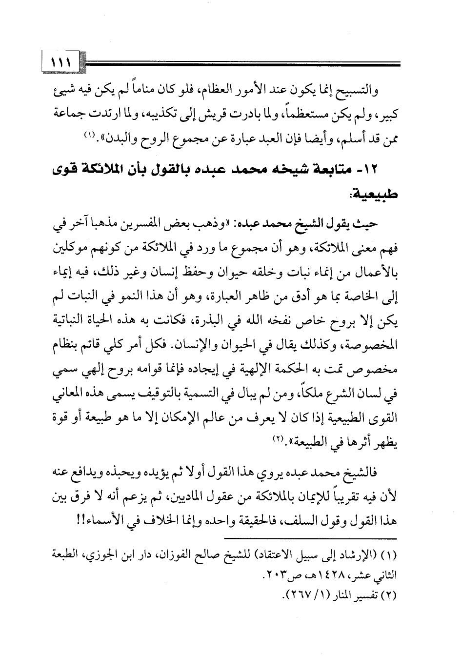 12 - متابعة شيخه محمد عبده بالقول بأن الملائكة قوى طبيعية:
