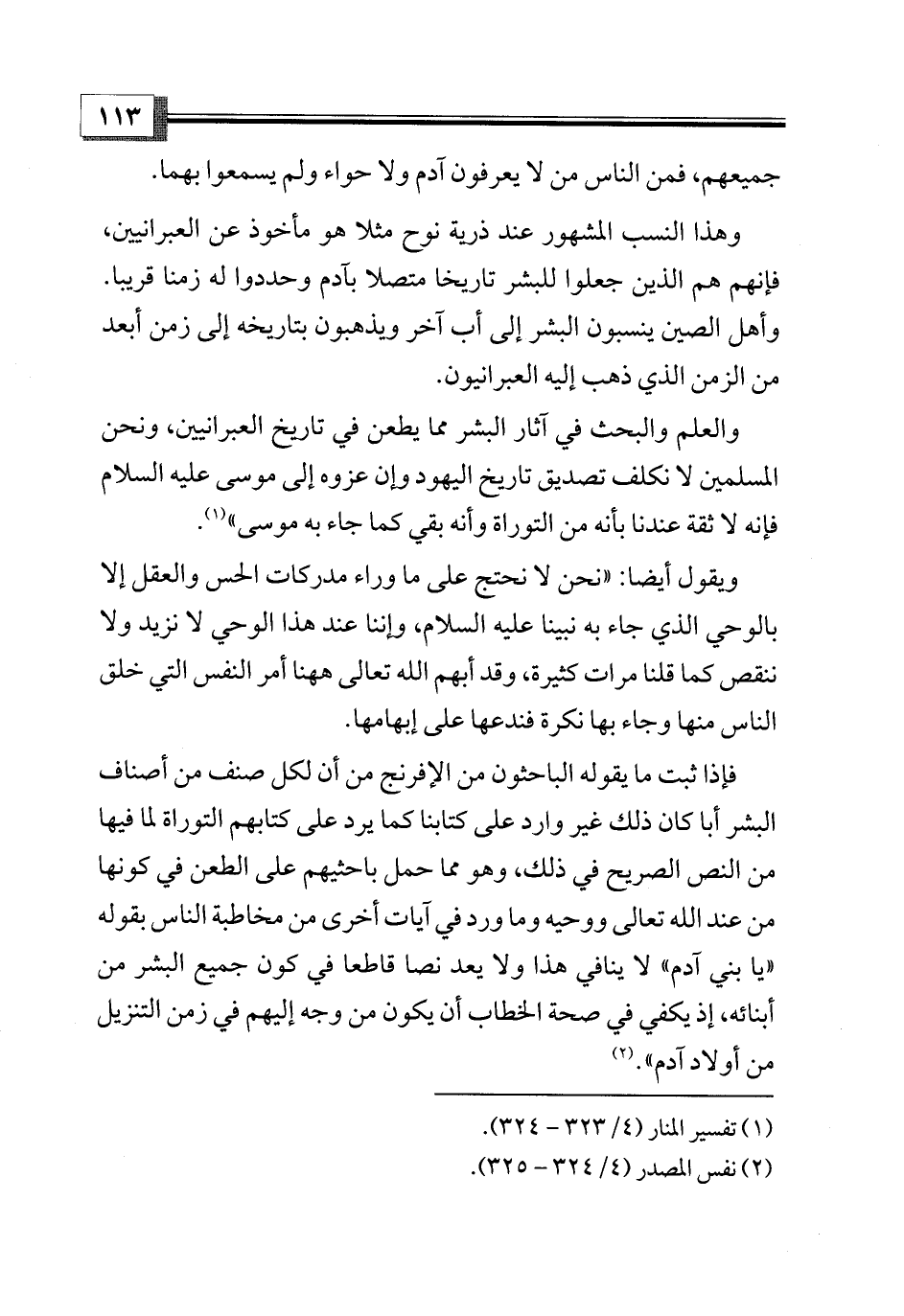 فإذا ثبت ما يقوله الباحثون من الإفرنج من أن لكل صنف من أصناف البشر أبا كان ذلك غير وارد على كتابنا كما يرد على كتابهم التوراة لما فيها من النص الصريح في ذلك، وهو مما حمل باحثيهم على الطعن في كونها من عند الله تعالى ووحيه وما ورد في آيات أخرى من مخاطبة الناس بقوله «يا بني آدم» لا ينافي هذا ولا يعد نصا قاطعا في كون جميع البشر من أبنائه، إذ يكفي في صحة الخطاب أن يكون من وجه إليهم في زمن التنزيل من أولاد آدم». (¬2)