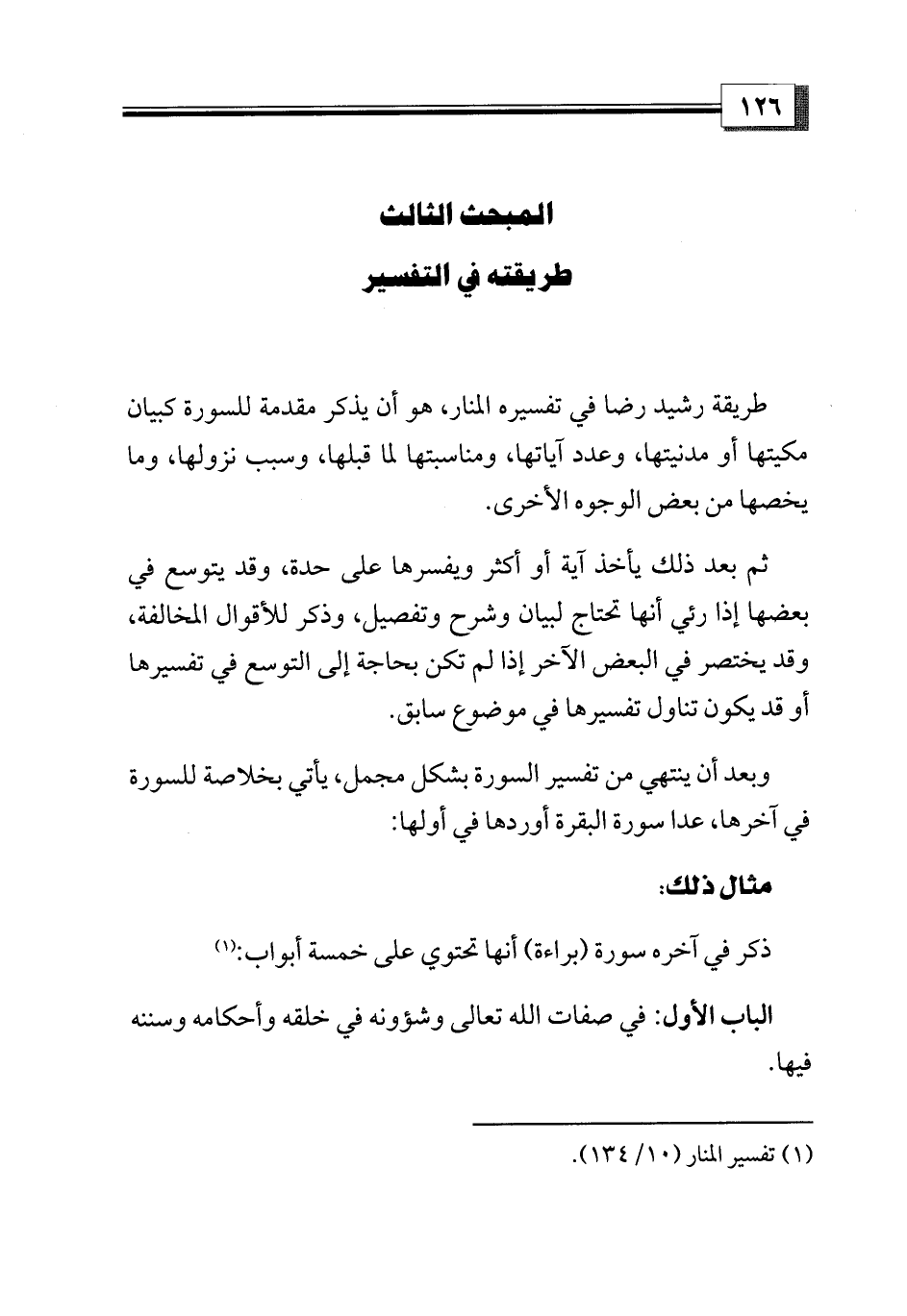 طريقة رشيد رضا في تفسيره المنار، هو أن يذكر مقدمة للسورة كبيان مكيتها أو مدنيتها، وعدد آياتها، ومناسبتها لما قبلها، وسبب نزولها، وما يخصها من بعض الوجوه الأخرى.