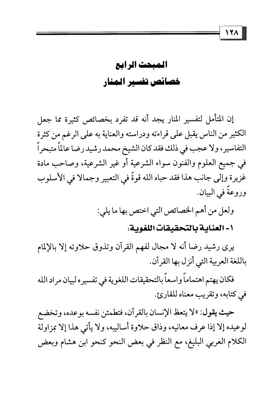 إن المتأمل لتفسير المنار يجد أنه قد تفرد بخصائص كثيرة مما جعل الكثير من الناس يقبل على قراءته ودراسته والعناية به على الرغم من كثرة التفاسير، ولا عجب في ذلك فقد كان الشيخ محمد رشيد رضا عالماً متبحراً في جميع العلوم والفنون سواء الشرعية أو غير الشرعية، وصاحب مادة غزيرة وإلى جانب هذا فقد حباه الله قوةً في التعبير وجمالا في الأسلوب وروعةً في البيان.