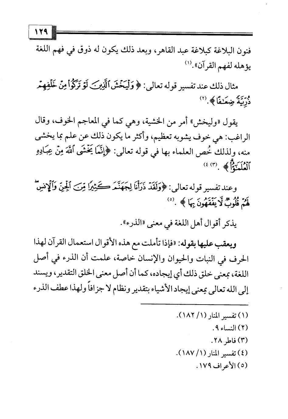 فنون البلاغة كبلاغة عبد القاهر، وبعد ذلك يكون له ذوق في فهم اللغة يؤهله لفهم القرآن». (¬1)