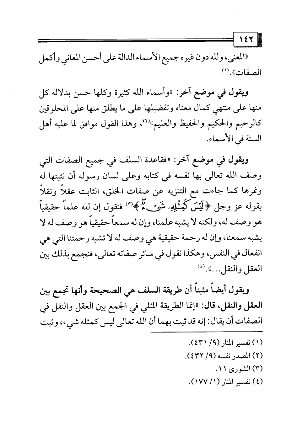 ويقول أيضاً مثبتاً أن طريقة السلف هي الصحيحة وأنها تجمع بين العقل والنقل، قال: «إنما الطريقة المثلي في الجمع بين العقل والنقل في الصفات أن يقال: إنه قد ثبت بهما أن الله تعالى ليس كمثله شيء، وثبت