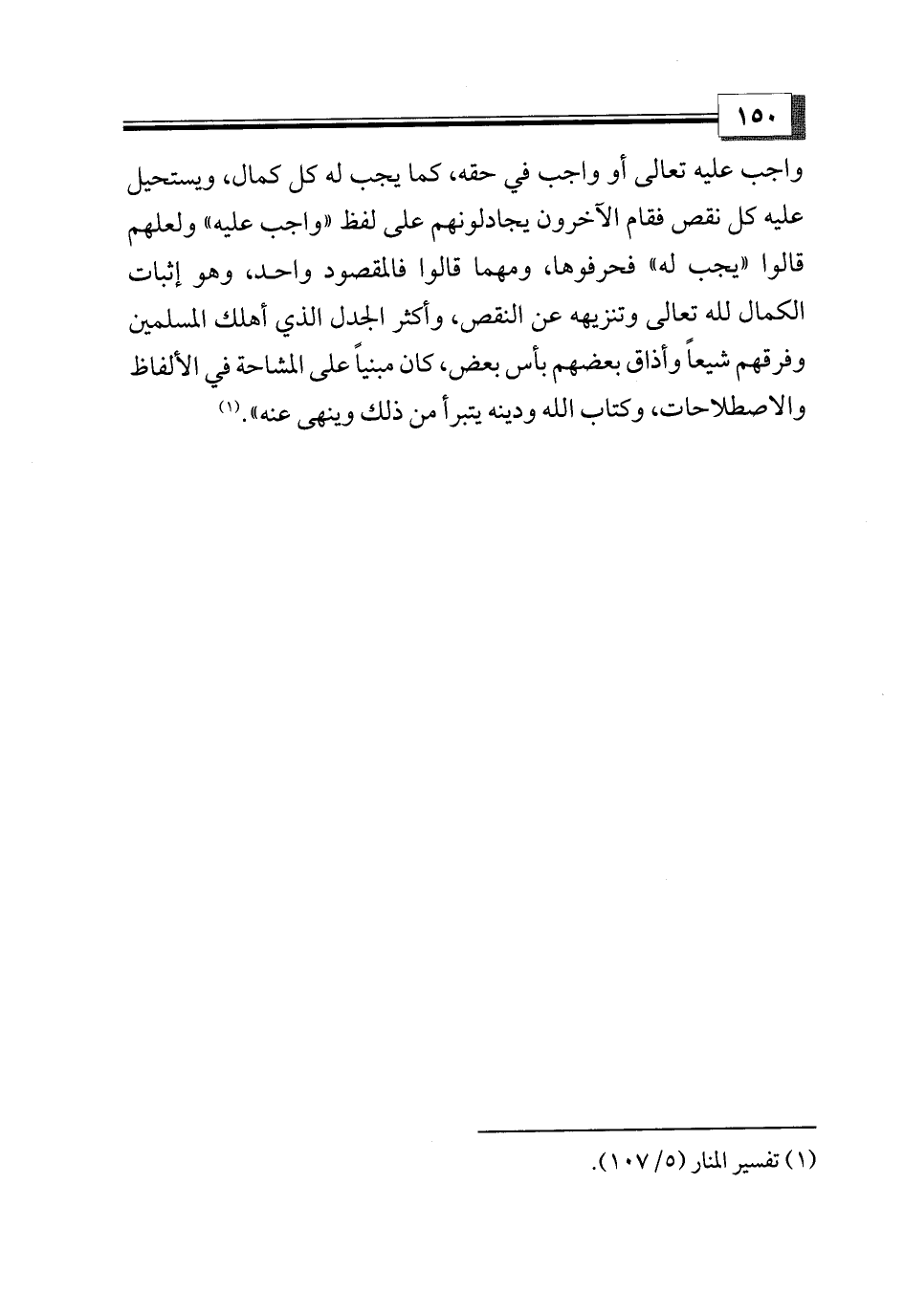 واجب عليه تعالى أو واجب في حقه، كما يجب له كل كمال، ويستحيل عليه كل نقص فقام الآخرون يجادلونهم على لفظ «واجب عليه» ولعلهم قالوا «يجب له» فحرفوها، ومهما قالوا فالمقصود واحد، وهو إثبات الكمال لله تعالى وتنزيهه عن النقص، وأكثر الجدل الذي أهلك المسلمين وفرقهم شيعاً وأذاق بعضهم بأس بعض، كان مبنياً على المشاحة في الألفاظ والاصطلاحات، وكتاب الله ودينه يتبرأ من ذلك وينهى عنه». (¬1)