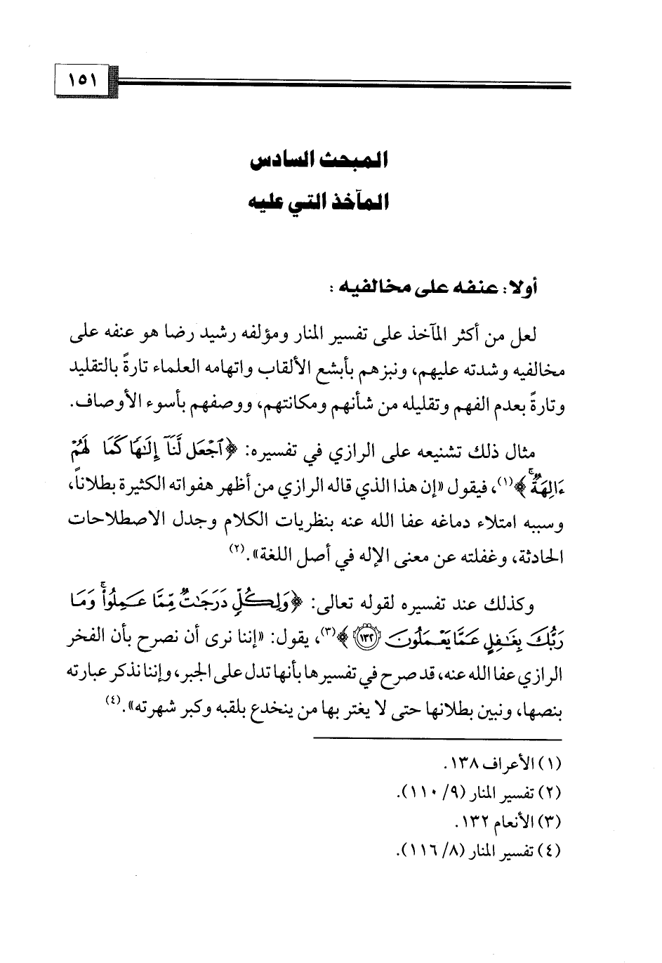 وكذلك عند تفسيره لقوله تعالى: {وَلِكُلٍّ دَرَجَاتٌ مِمَّا عَمِلُوا وَمَا رَبُّكَ بِغَافِلٍ عَمَّا يَعْمَلُونَ (132)} (¬3)، يقول: «إننا نرى أن نصرح بأن الفخر الرازي عفا الله عنه، قد صرح في تفسيرها بأنها تدل على الجبر، وإننا نذكر عبارته بنصها، ونبين بطلانها حتى لا يغتر بها من ينخدع بلقبه وكبر شهرته». (¬4)