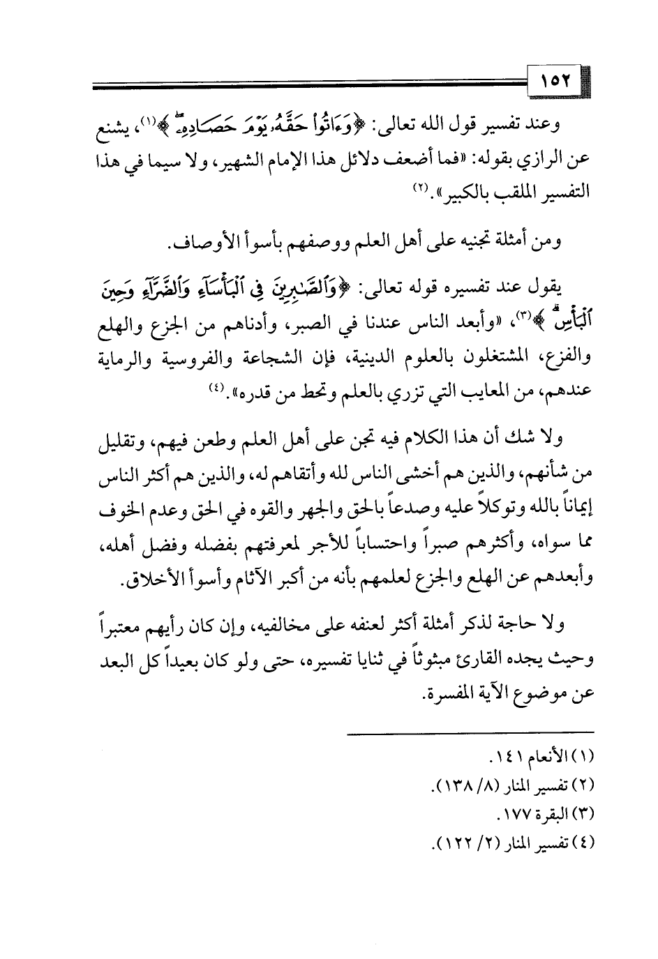 وعند تفسير قول الله تعالى: {وَآتُوا حَقَّهُ يَوْمَ حَصَادِهِ} (¬1)، يشنع عن الرازي بقوله: «فما أضعف دلائل هذا الإمام الشهير، ولا سيما في هذا التفسير الملقب بالكبير». (¬2)