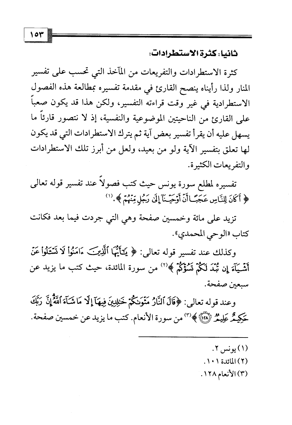 وكذلك عند تفسير قوله تعالى: {يَاأَيُّهَا الَّذِينَ آمَنُوا لَا تَسْأَلُوا عَنْ أَشْيَاءَ إِنْ تُبْدَ لَكُمْ تَسُؤْكُمْ} (¬2) من سورة المائدة، حيث كتب ما يزيد عن سبعين صفحة.
