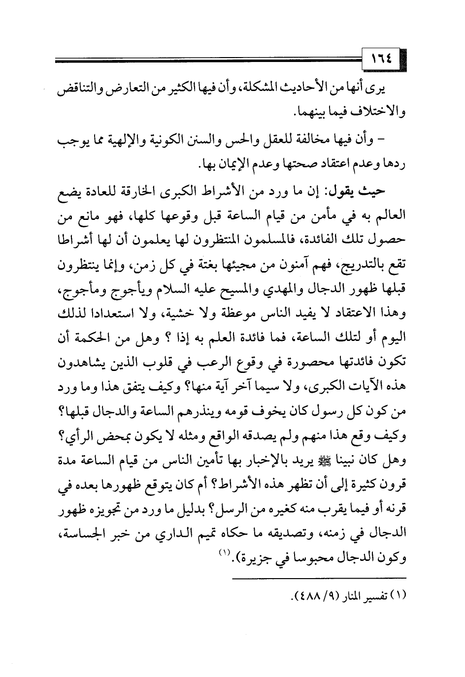 حيث يقول: إن ما ورد من الأشراط الكبرى الخارقة للعادة يضع العالم به في مأمن من قيام الساعة قبل وقوعها كلها، فهو مانع من حصول تلك الفائدة، فالمسلمون المنتظرون لها يعلمون أن لها أشراطا تقع بالتدريج، فهم آمنون من مجيئها بغتة في كل زمن، وإنما ينتظرون قبلها ظهور الدجال والمهدي والمسيح عليه السلام ويأجوج ومأجوج، وهذا الاعتقاد لا يفيد الناس موعظة ولا خشية، ولا استعدادا لذلك اليوم أو لتلك الساعة، فما فائدة العلم به إذا؟ وهل من الحكمة أن تكون فائدتها محصورة في وقوع الرعب في قلوب الذين يشاهدون هذه الآيات الكبرى، ولا سيما آخر آية منها؟ وكيف يتفق هذا وما ورد من كون كل رسول كان يخوف قومه وينذرهم الساعة والدجال قبلها؟ وكيف وقع هذا منهم ولم يصدقه الواقع ومثله لا يكون بمحض الرأي؟ وهل كان نبينا - صلى الله عليه وسلم - يريد بالإخبار بها تأمين الناس من قيام الساعة مدة قرون كثيرة إلى أن تظهر هذه الأشراط؟ أم كان يتوقع ظهورها بعده في قرنه أو فيما يقرب منه كغيره من الرسل؟ بدليل ما ورد من تجويزه ظهور الدجال في زمنه، وتصديقه ما حكاه تميم الداري من خبر الجساسة، وكون الدجال محبوسا في جزيرة). (¬1)