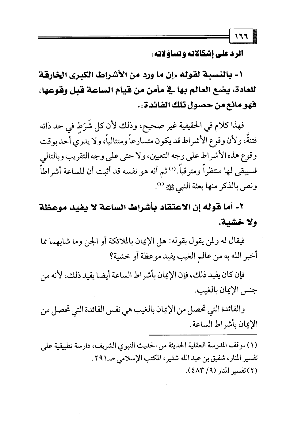 (¬1) موقف المدرسة العقلية الحديثة من الحديث النبوي الشريف، دارسة تطبيقية على تفسير المنار، شفيق بن عبد الله شقير، المكتب الإسلامي صـ 291.