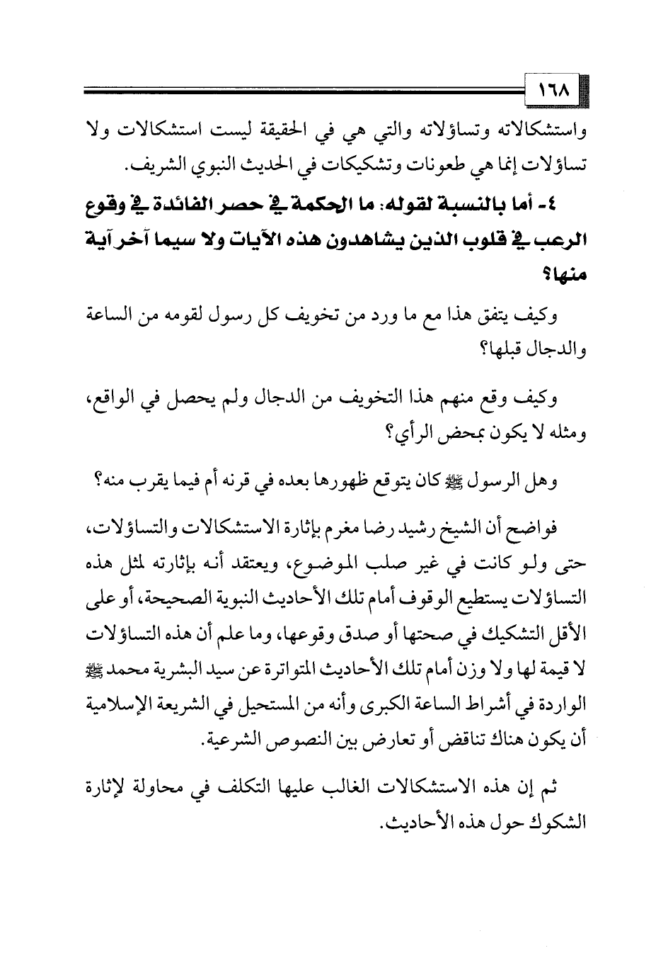 فواضح أن الشيخ رشيد رضا مغرم بإثارة الاستشكالات والتساؤلات، حتى ولو كانت في غير صلب الموضوع، ويعتقد أنه بإثارته لمثل هذه التساؤلات يستطيع الوقوف أمام تلك الأحاديث النبوية الصحيحة، أو على الأقل التشكيك في صحتها أو صدق وقوعها، وما علم أن هذه التساؤلات لا قيمة لها ولا وزن أمام تلك الأحاديث المتواترة عن سيد البشرية محمد - صلى الله عليه وسلم - الواردة في أشراط الساعة الكبرى وأنه من المستحيل في الشريعة الإسلامية أن يكون هناك تناقض أو تعارض بين النصوص الشرعية.