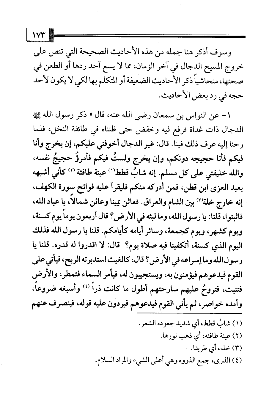 1 - عن النواس بن سمعان رضي الله عنه، قال «ذكر رسول الله - صلى الله عليه وسلم - الدجال ذات غداة فرفع فيه وخفض حتى ظنناه في طائفة النخل، فلما رحنا إليه عرف ذلك فينا. قال: غير الدجال أخوفني عليكم، إن يخرج وأنا فيكم فأنا حجيجه دونكم، وإن يخرج ولستُ فيكم فأمرؤُ حجيجُ نفسه، والله خليفتي على كل مسلم. إنه شابٌ قطط (¬1) عينة طافئة (¬2) كأني أشبهه بعبد العزى ابن قطن، فمن أدركه منكم فليقرأ عليه فواتح سورة الكهف، إنه خارج خلة (¬3) بين الشام والعراق. فعاثن يمينا وعاثن شمالاً، يا عباد الله، فاثبتوا، قلنا: يا رسول الله، وما لبثه في الأرض؟ قال أربعون يوماً يوم كسنة، ويوم كشهر، ويوم كجمعة، وسائر أيامه كأيامكم. قلنا يا رسول الله فذلك اليوم الذي كسنة، أتكفينا فيه صلاة يوم؟ قال: لا اقدروا له قدره. قلنا يا رسول الله وما إسراعه في الأرض؟ قال، كالغيث استدبرته الريح، فيأتي على القوم فيدعوهم فيؤمنون به، ويستجيبون له، فيأمر السماء فتمطر، والأرض فتنبت، فتروحُ عليهم سارحتهم أطول ما كانت ذراً (¬4) وأسبغه ضروعاً، وأمده خواصر، ثم يأتي القوم فيدعوهم فيردون عليه قوله، فينصرف عنهم
