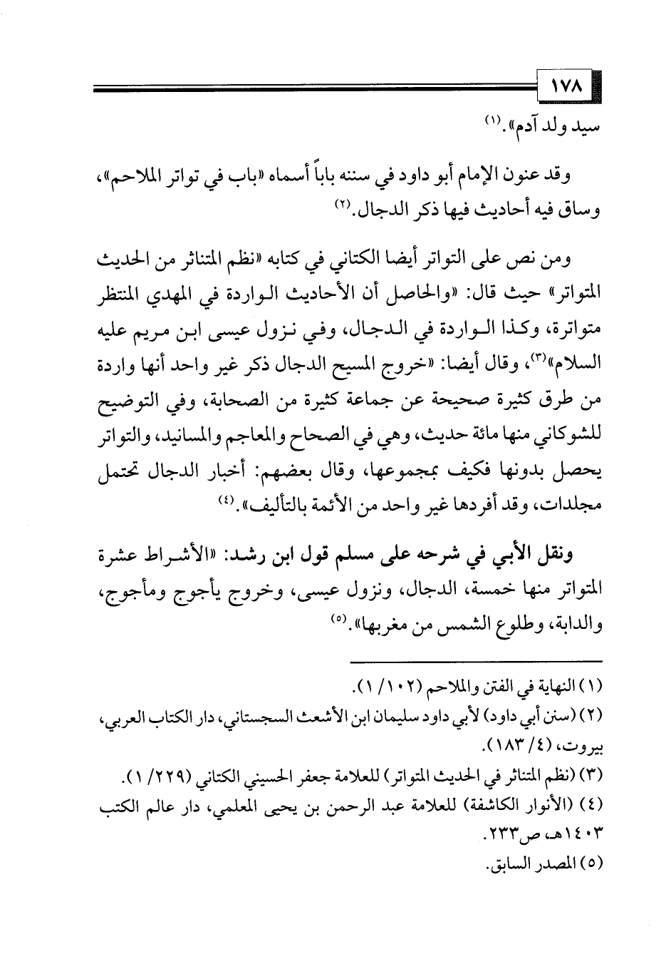 ومن نص على التواتر أيضا الكتاني في كتابه «نظم المتناثر من الحديث المتواتر» حيث قال: «والحاصل أن الأحاديث الواردة في المهدي المنتظر متواترة، وكذا الواردة في الدجال، وفي نزول عيسى ابن مريم عليه السلام» (¬3)، وقال أيضا: «خروج المسيح الدجال ذكر غير واحد أنها واردة من طرق كثيرة صحيحة عن جماعة كثيرة من الصحابة، وفي التوضيح للشوكاني منها مائة حديث، وهي في الصحاح والمعاجم والمسانيد، والتواتر يحصل بدونها فكيف بمجموعها، وقال بعضهم: أخبار الدجال تحتمل مجلدات، وقد أفردها غير واحد من الأئمة بالتأليف». (¬4)
