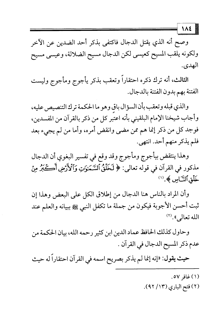 والذي قبله وتعقب بأن السؤال باقٍ وهو ما الحكمة ترك التنصيص عليه، وأجاب شيخنا الإمام البلقيني بأنه اعتبر كل من ذكر بالقرآن من المفسدين، فوجد كل من ذكر إنما هم ممن مضى وانقض أمره، وأما من لم يجيء بعد فلم يذكر منهم أحد. انتهى.