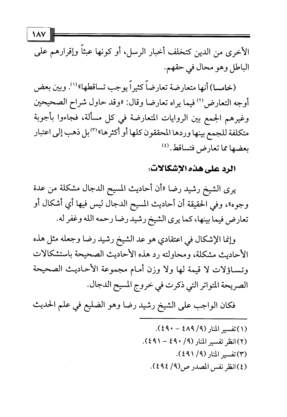 وإنما الإشكال في اعتقادي هو عد الشيخ رشيد رضا وجعله مثل هذه الأحاديث مشكلة، ومحاولته رد هذه الأحاديث الصحيحة باستشكالات وتساؤلات لا قيمة لها ولا وزن أمام مجموعة الأحاديث الصحيحة الصريحة المتواتر التي ذكرت في خروج المسيح الدجال.