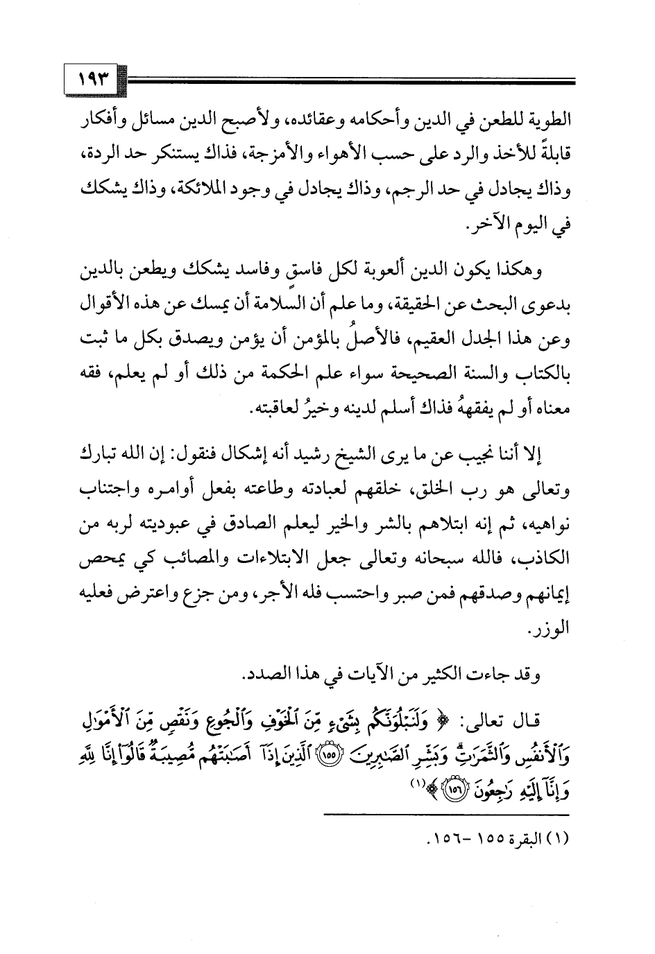 إلا أننا نجيب عن ما يرى الشيخ رشيد أنه إشكال فنقول: إن الله تبارك وتعالى هو رب الخلق، خلقهم لعبادته وطاعته بفعل أوامره واجتناب نواهيه، ثم إنه ابتلاهم بالشر والخير ليعلم الصادق في عبوديته لربه من الكاذب، فالله سبحانه وتعالى جعل الابتلاءات والمصائب كي يمحص إيمانهم وصدقهم فمن صبر واحتسب فله الأجر، ومن جزع واعترض فعليه الوزر.