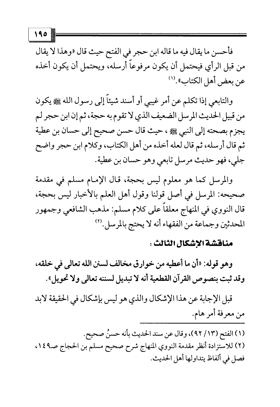 والمرسل كما هو معلوم ليس بحجة، قال الإمام مسلم في مقدمة صحيحه: المرسل في أصل قولنا وقول أهل العلم بالأخبار ليس بحجة، قال النووي في المنهاج معلقاً على كلام مسلم: مذهب الشافعي وجمهور المحدثين وجماعة من الفقهاء أنه لا يحتج بالمرسل. (¬2)